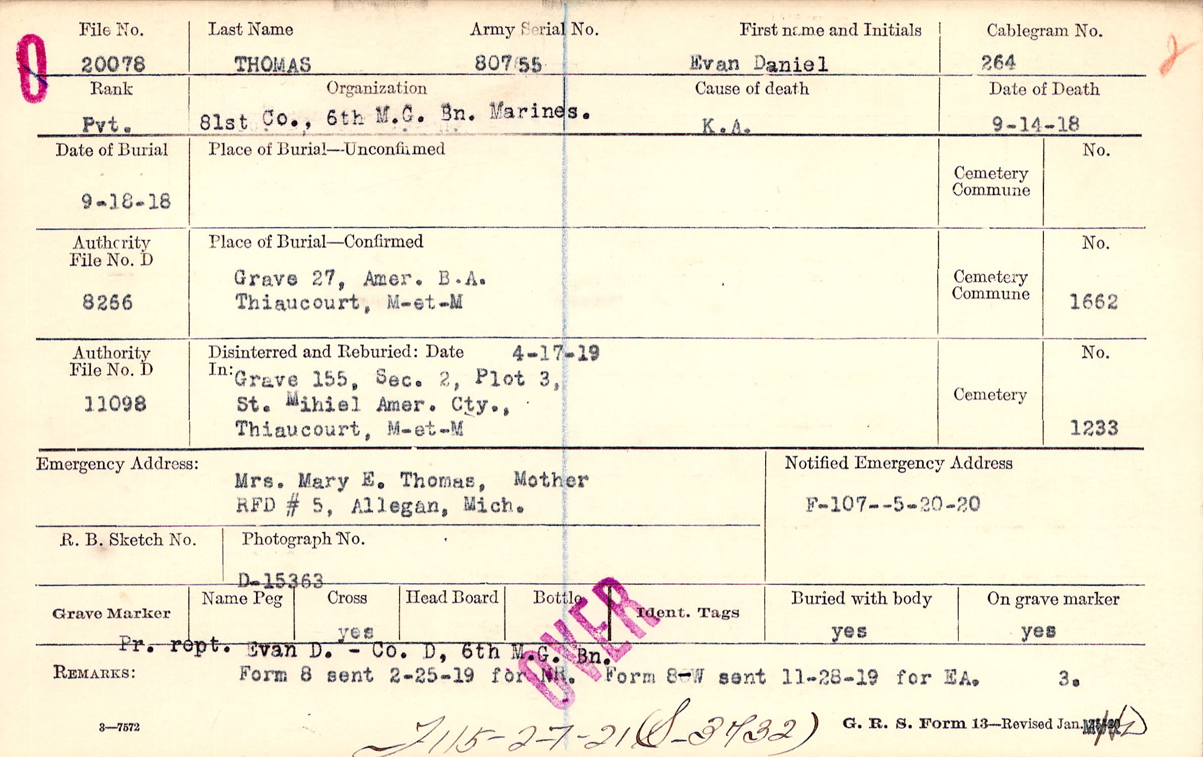 Pr. rept. Evan. D. - Co. D, 6th M.G. Bn., Form 8 sent 2-25-19 for NR., F115 -2-7-21 (S-3732)