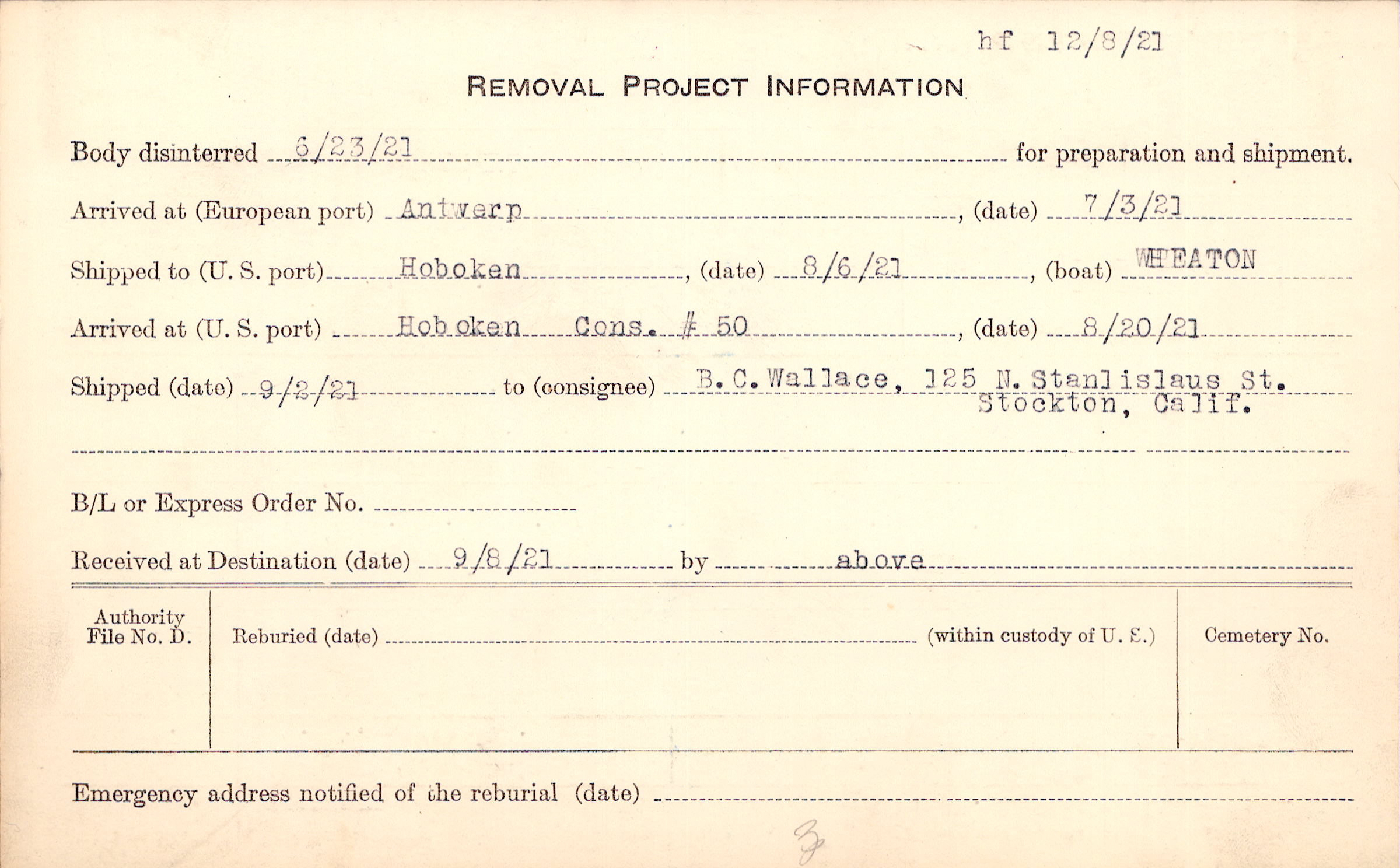 Body disinterred 6/23/1921 for preparation and shipment.