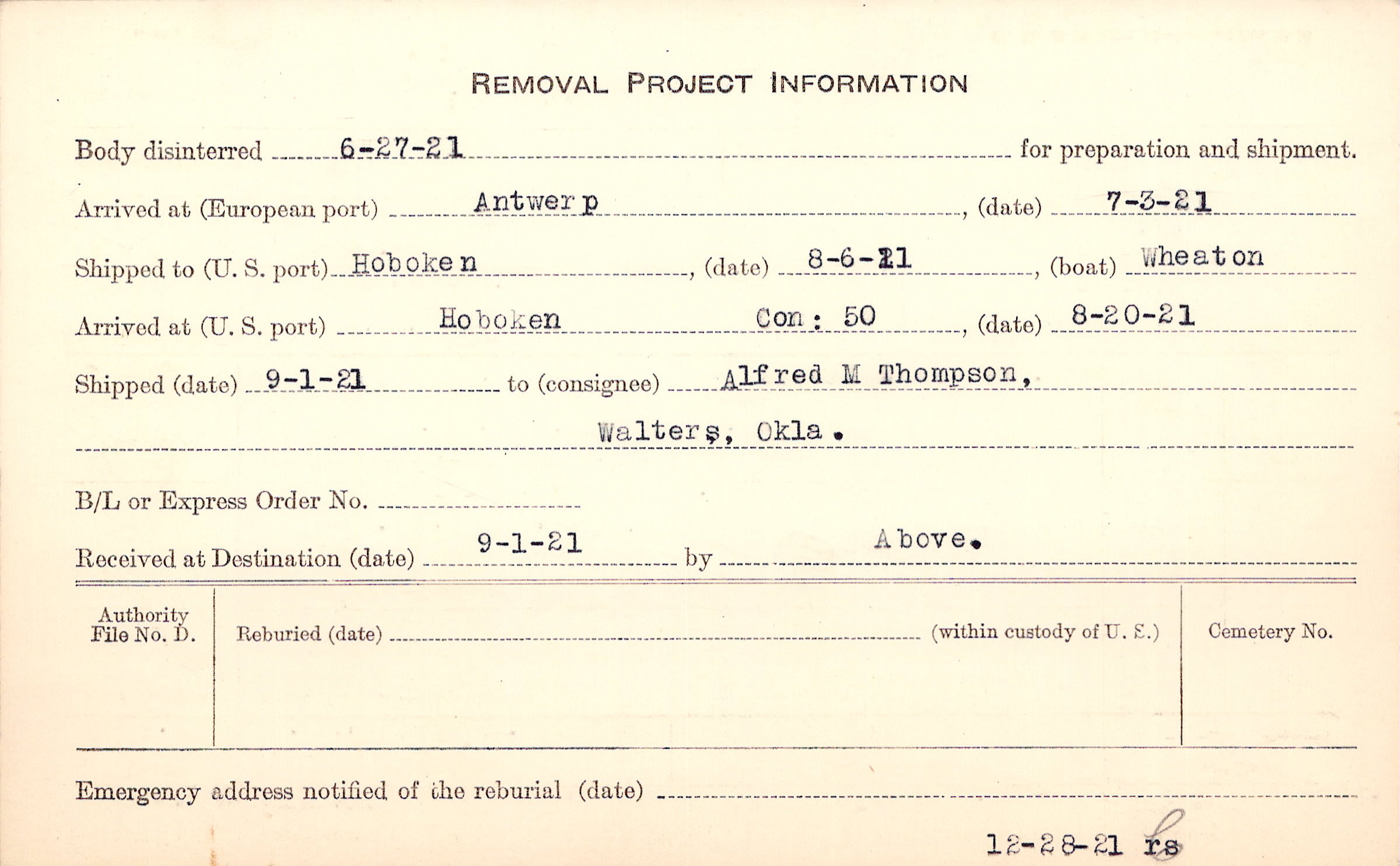 Body disinterred 6/27/1921 for preparation and shipment.