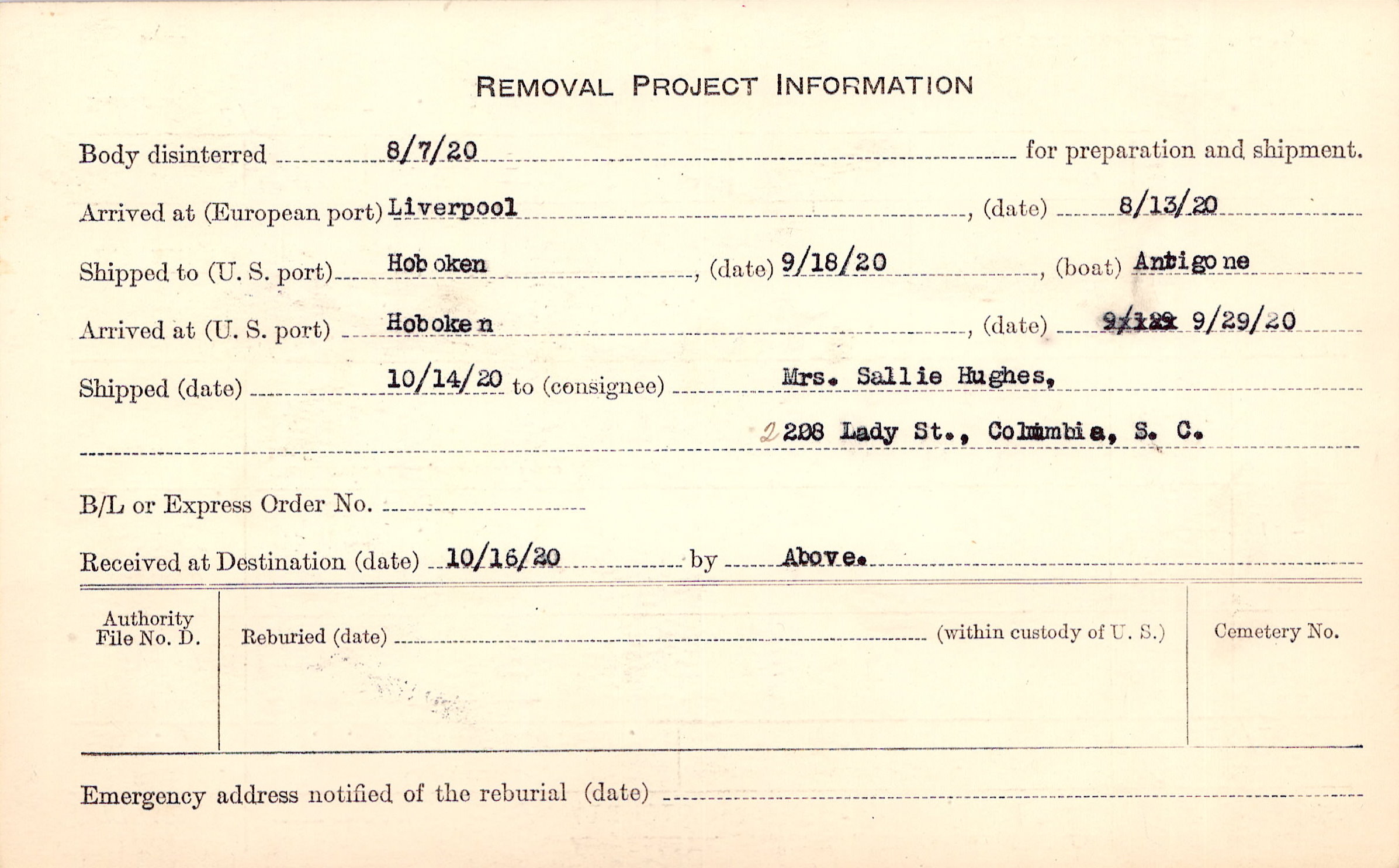 to Mrs. Sallie Hughes, 208 Lady St., Columbia, S. C.