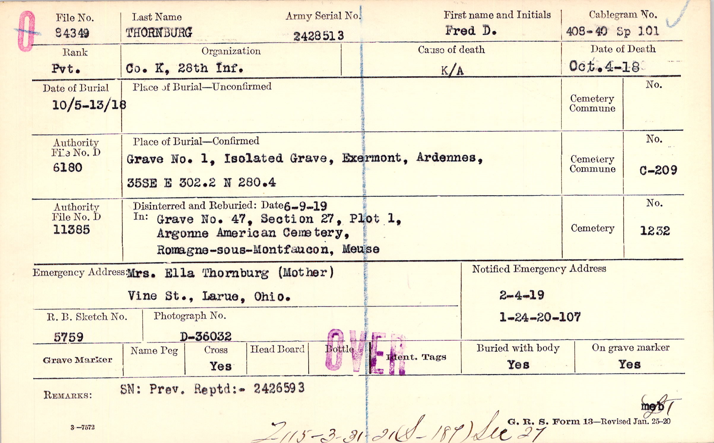 Grave No 1, Isolated Grave, Exermont, Ardennes, 35 SE.