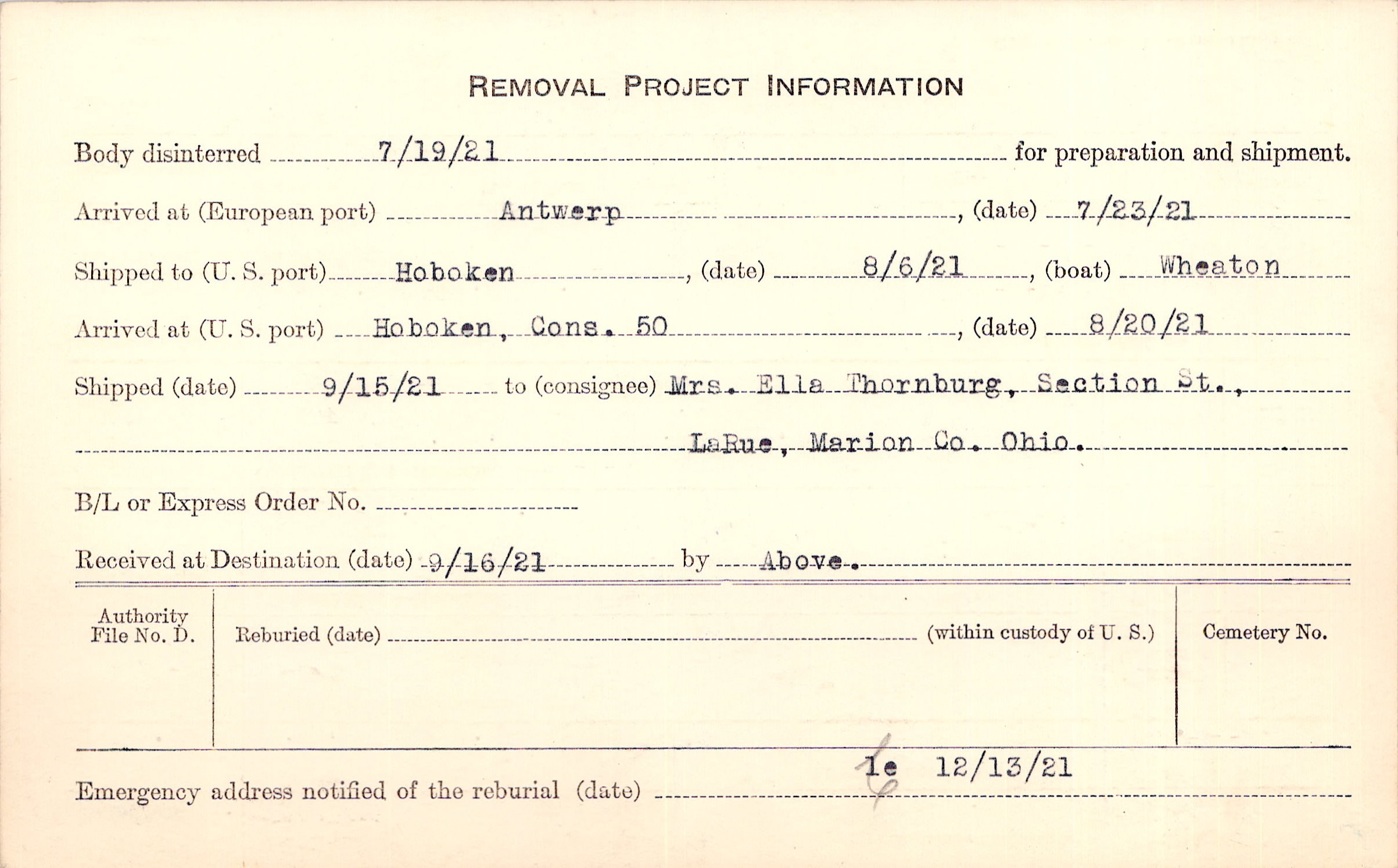 Mrs. Ella Thornburg (Mother), Vine St., Larue, Ohio.