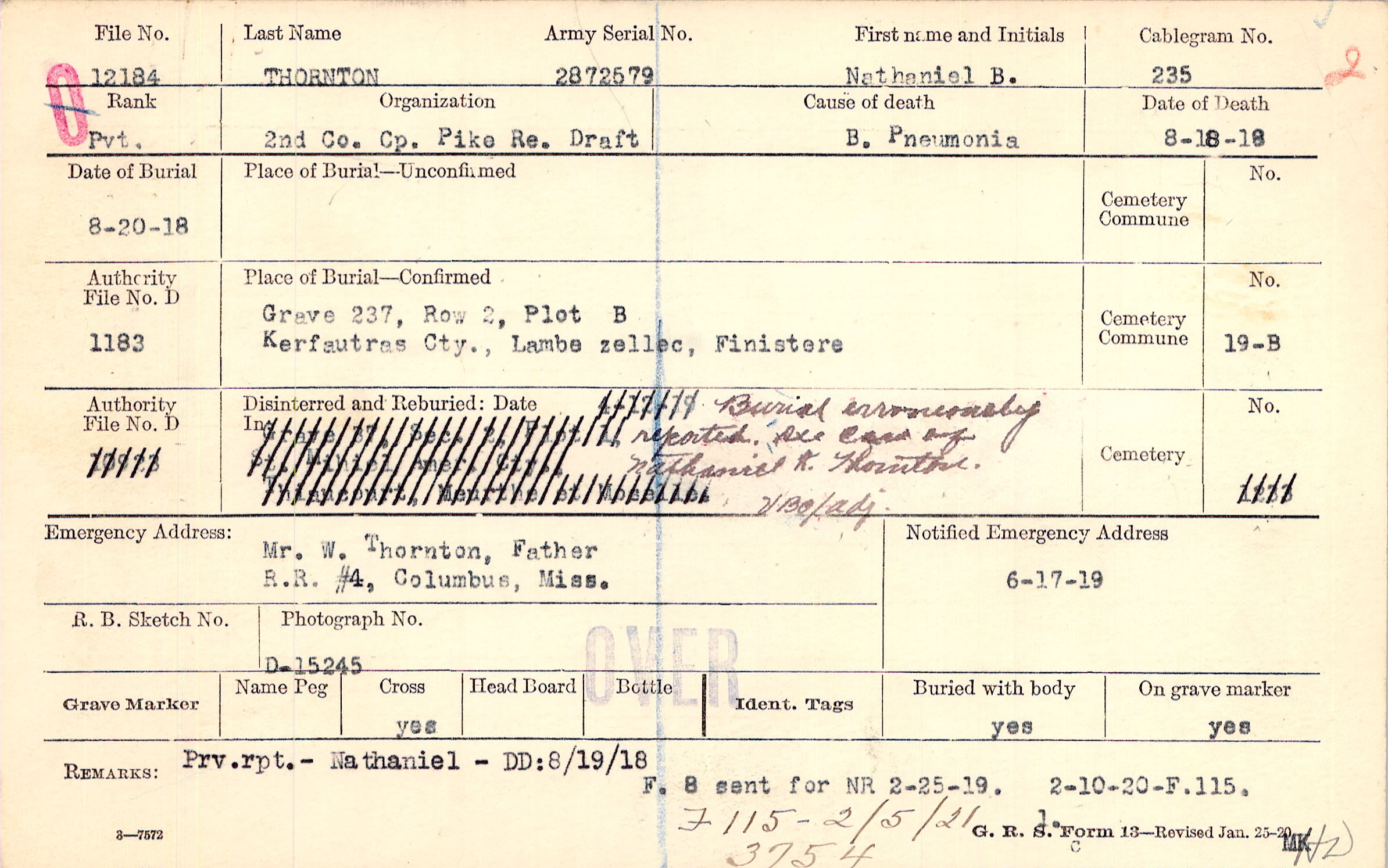 Mr. W. Thornton, Father, R.R. #4, Columbus, Miss., Prv. rpt. - Nathaniel - DD: 8/19/18
