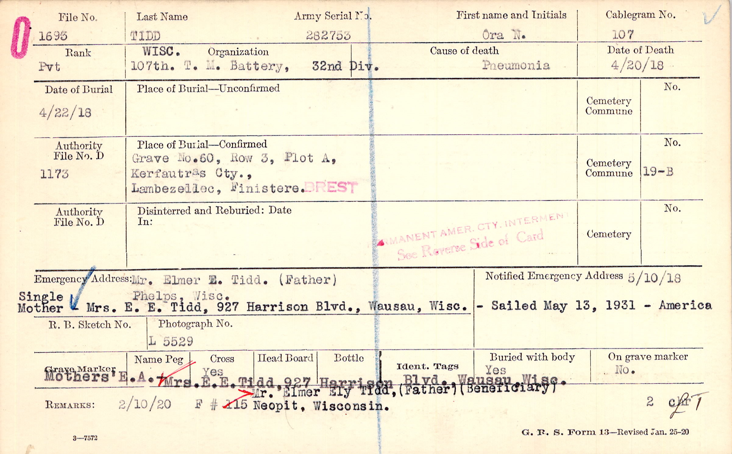 Mothers' E.A. - Mrs. E.E. Tidd, 927 Harrison Blvd., Wausau Wisc. Mr. Elmer Ely Tidd (Father) (Beneficiary), 2/10/20 F # 115