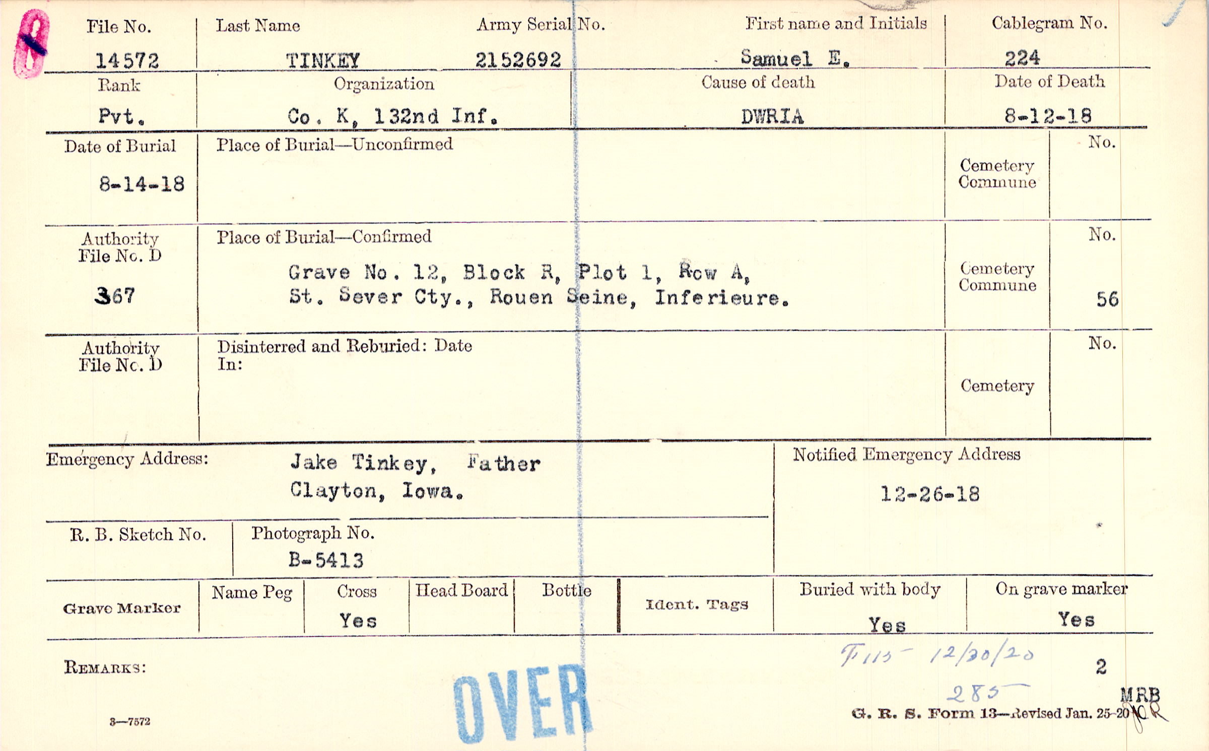 Grave 12, Block R, Plot 1, Row A, St. Sever Cty., Rouen Seine, Inferieure.