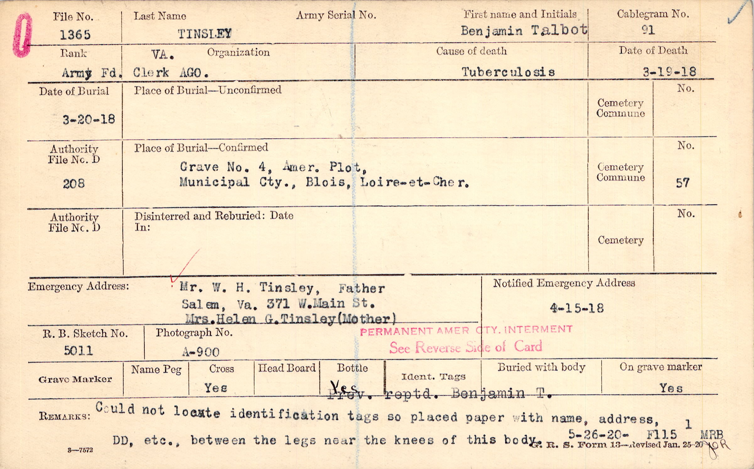Mr. W. H. Tinsley, Father, Salem, Va. 371 W.Main St., Mrs. Helen G. Tinsley (Mother)
