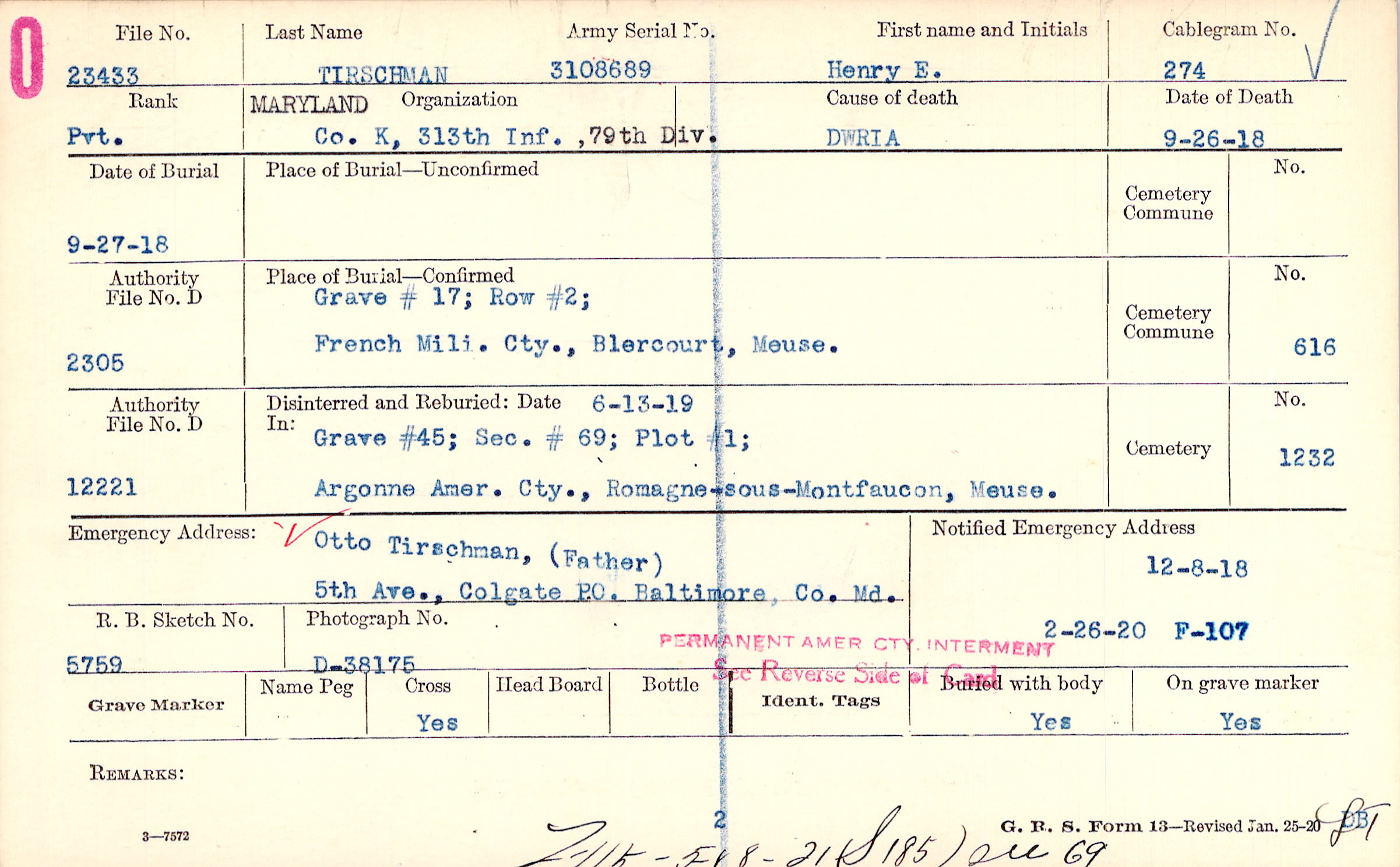 Otto Tirschman, (Father), 5th Ave., Colgate P.O. Baltimore, Co. Md.