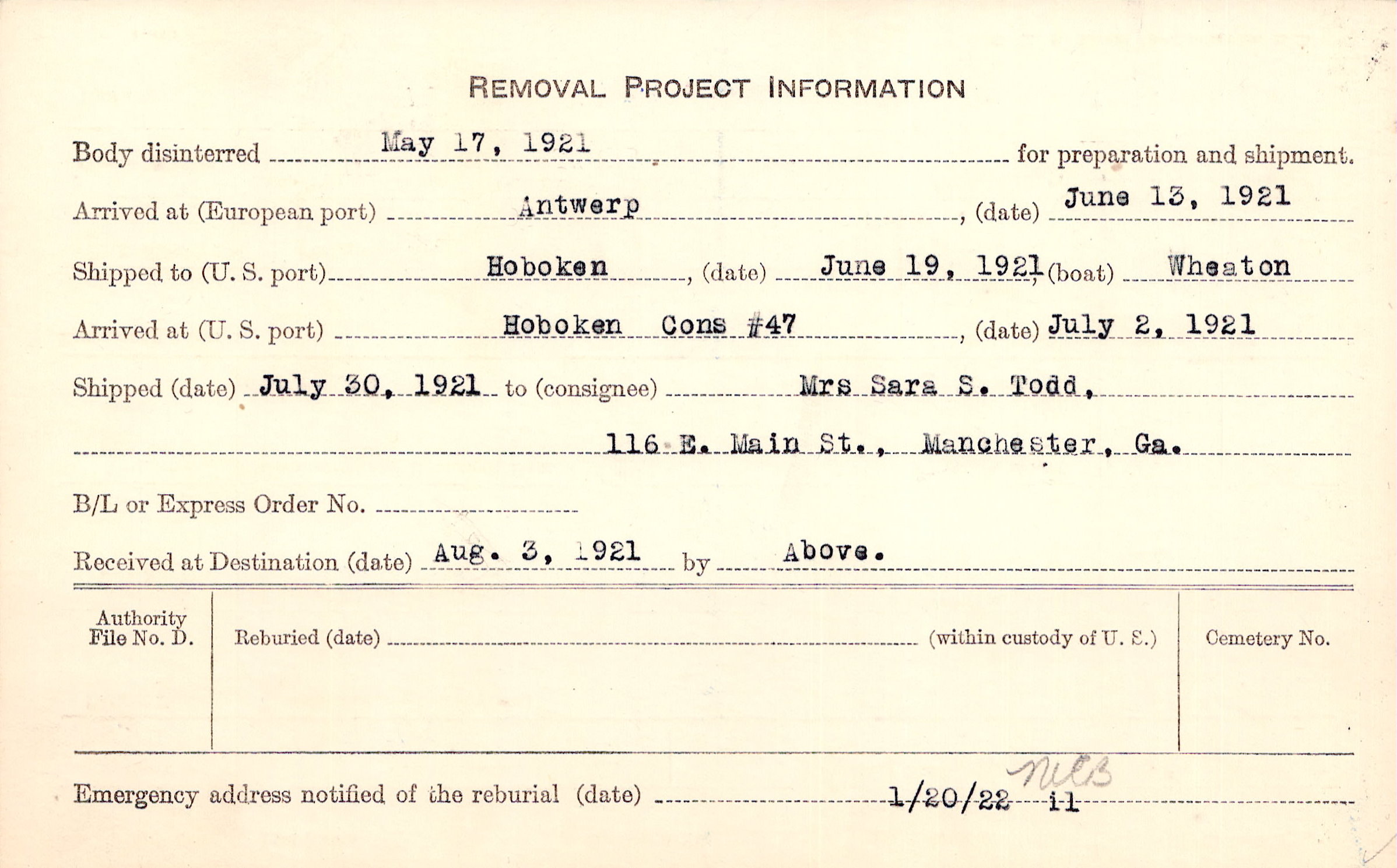Body disinterred 5/17/1921 for preparation and shipment.