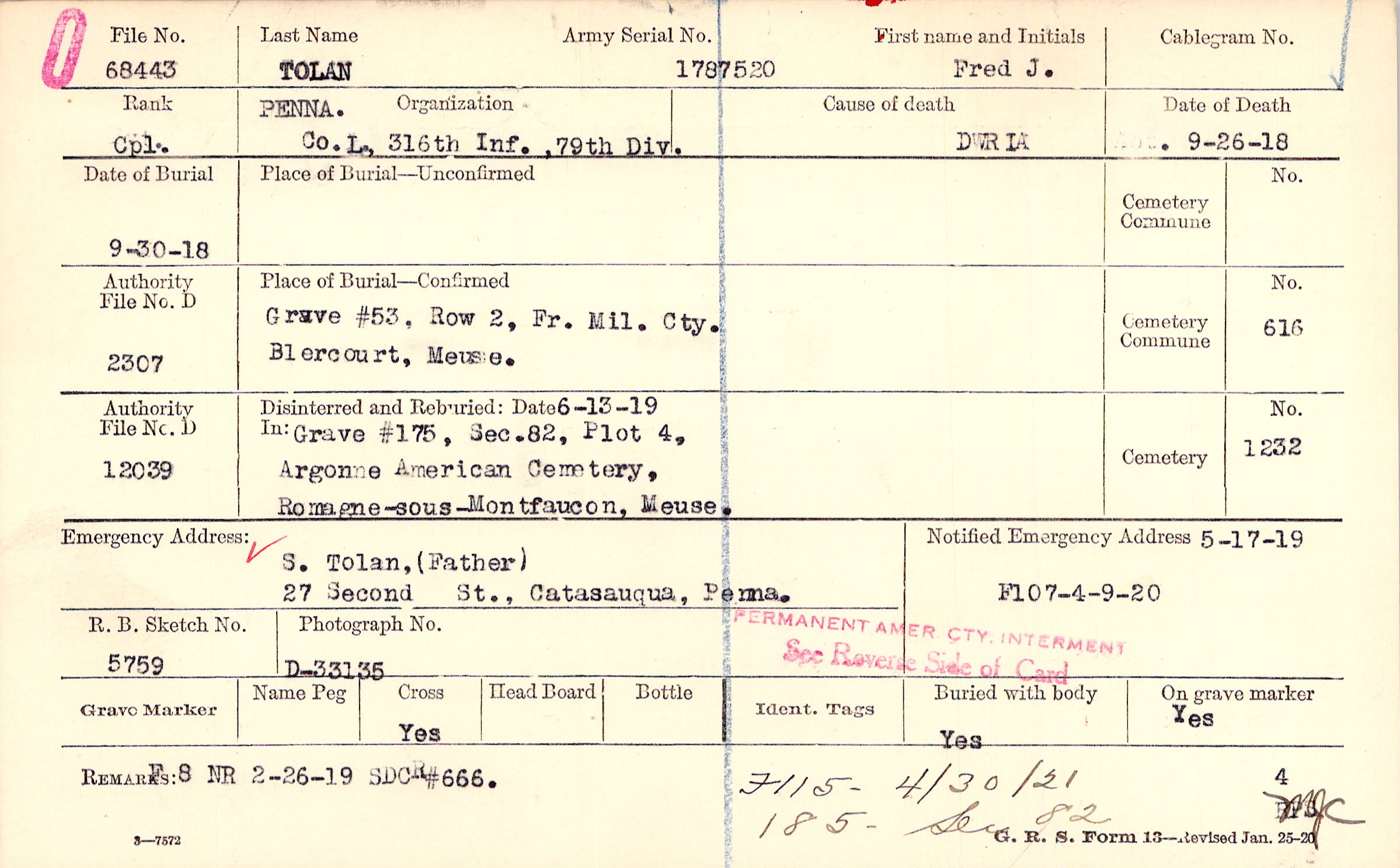 S. Tolan, (Father), 27 Second St., Catasauqua, Penna.