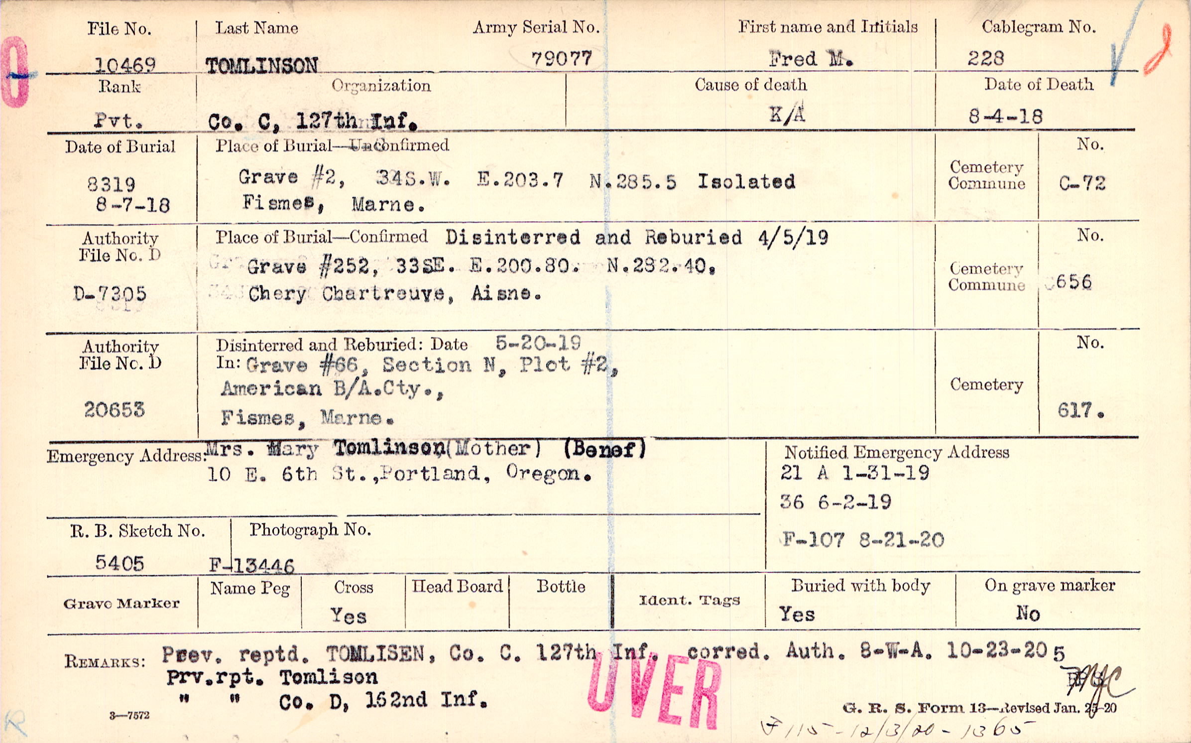 Prev. reptd. TOMLISEN, Co. C. 127th Inf. corred. Auth. 8-W-A. 10-23-20, F115 - 12/3/20 - 1365