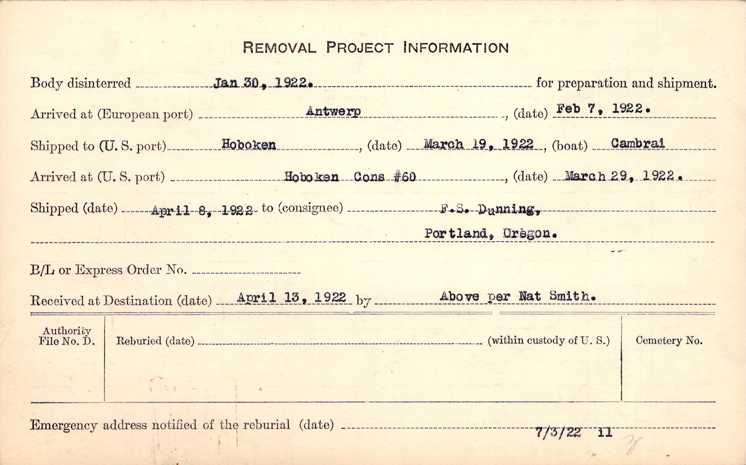 Body disinterred 1/30/1922 for preparation and shipment.