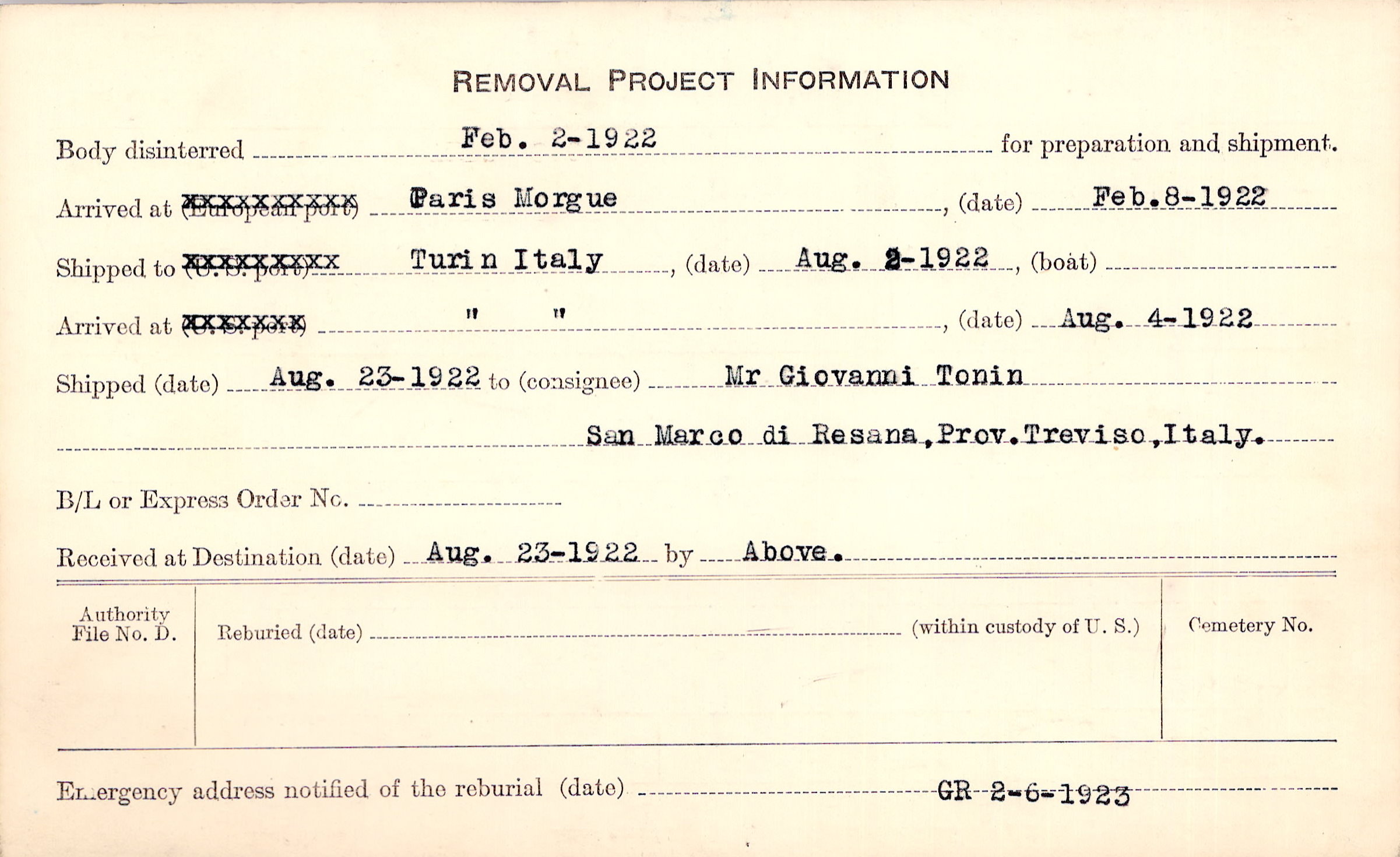 Body disinterred 2/2/1922 for preparation and shipment.
