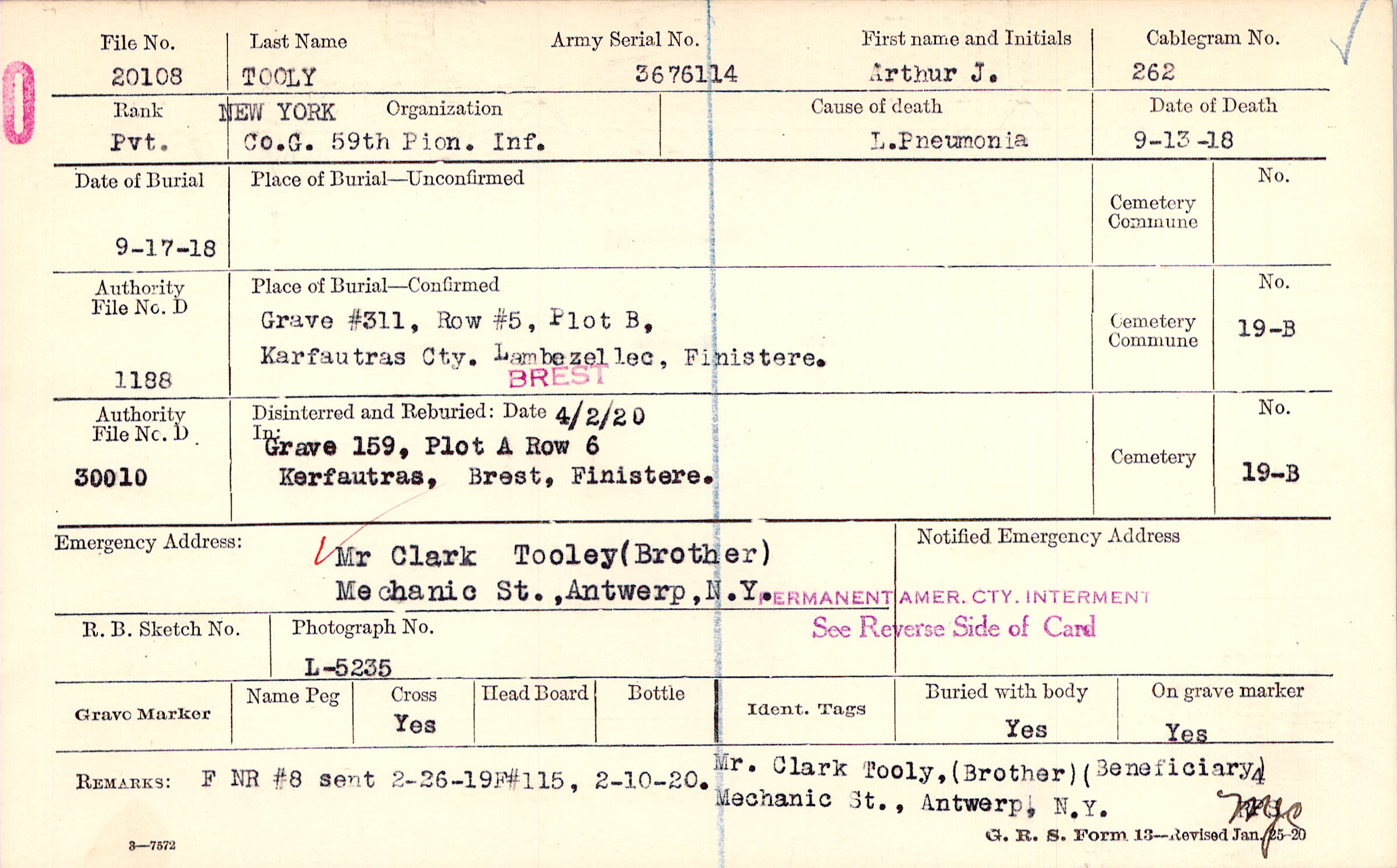 Mr. Clark Tooly, (Brother)(Beneficiary) Mechanic St., Antwerp, N.Y., F NR #8 sent 2-26-19, F#115, 2-10-20.