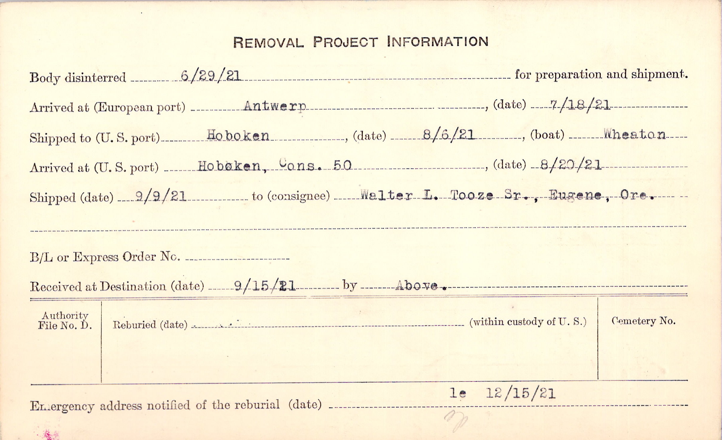 Body disinterred 6/29/1921 for preparation and shipment.