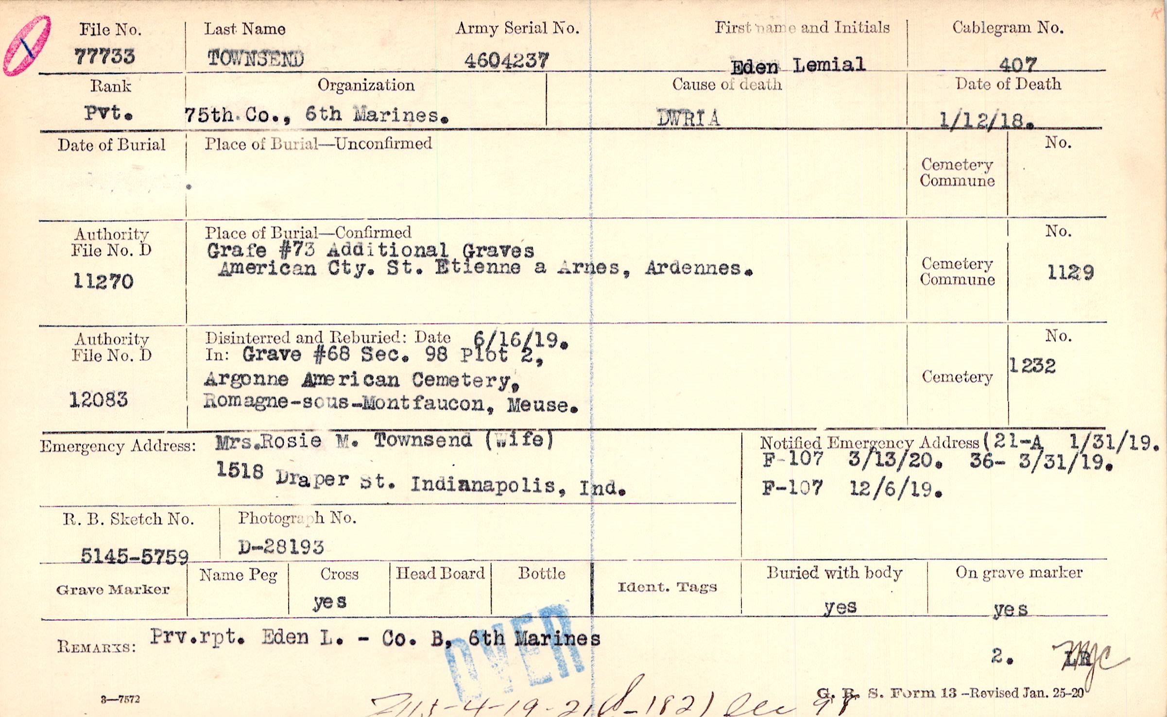 Mrs. Rosie M. Townsend (Wife), 1518 Draper St. Indianapolis, Ind.