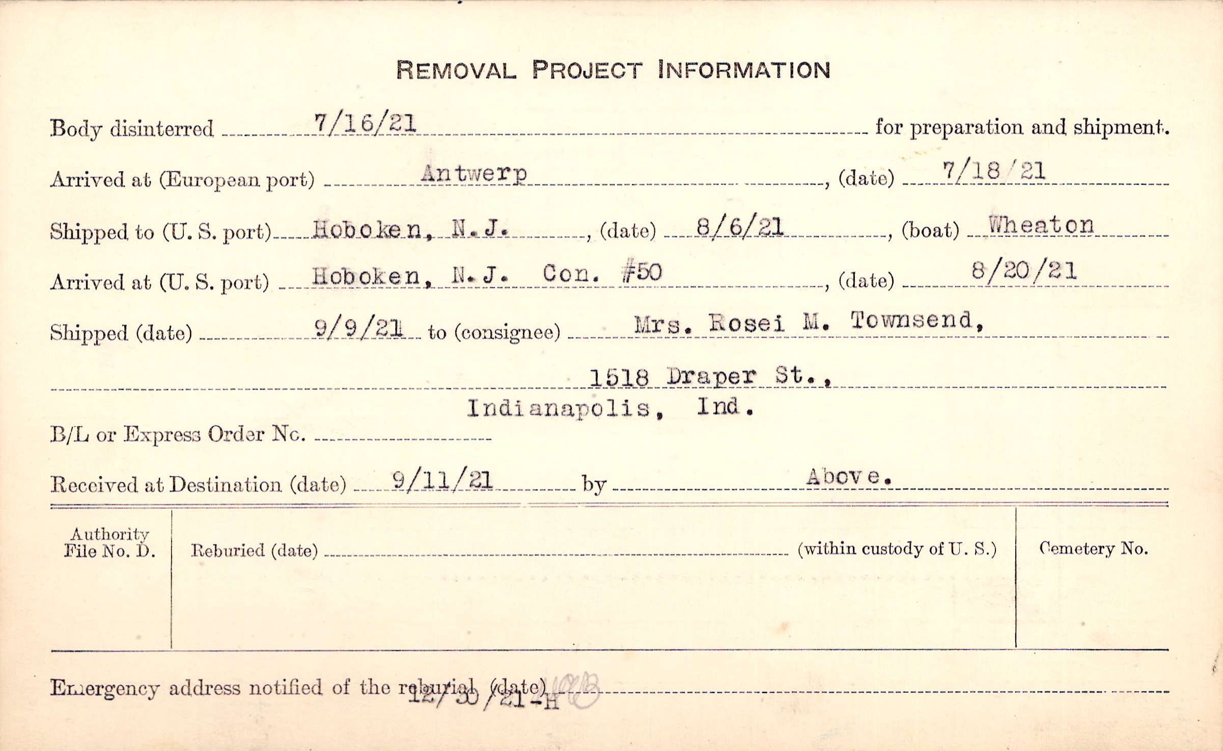 Body disinterred 7/16/1921 for preparation and shipment.