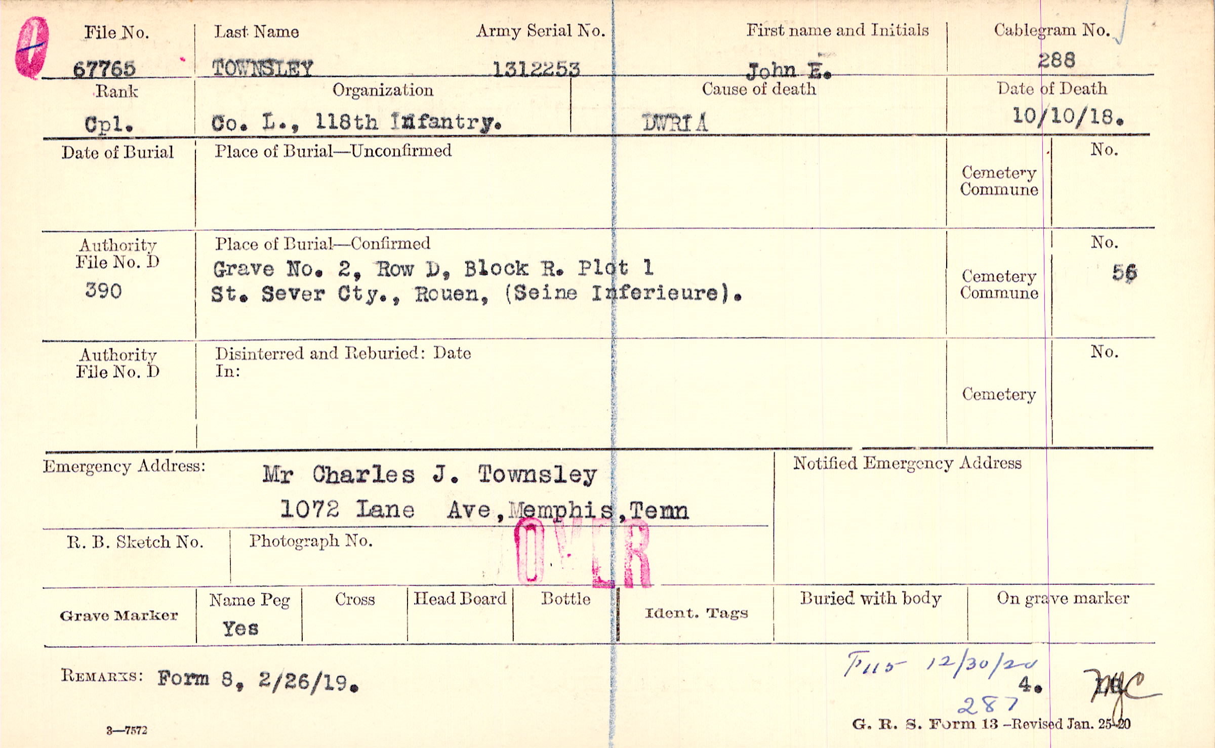 Grave 2, Row D, Block R. Plot 1, St. Sever Cty., Rouen, (Seine Inferieure).