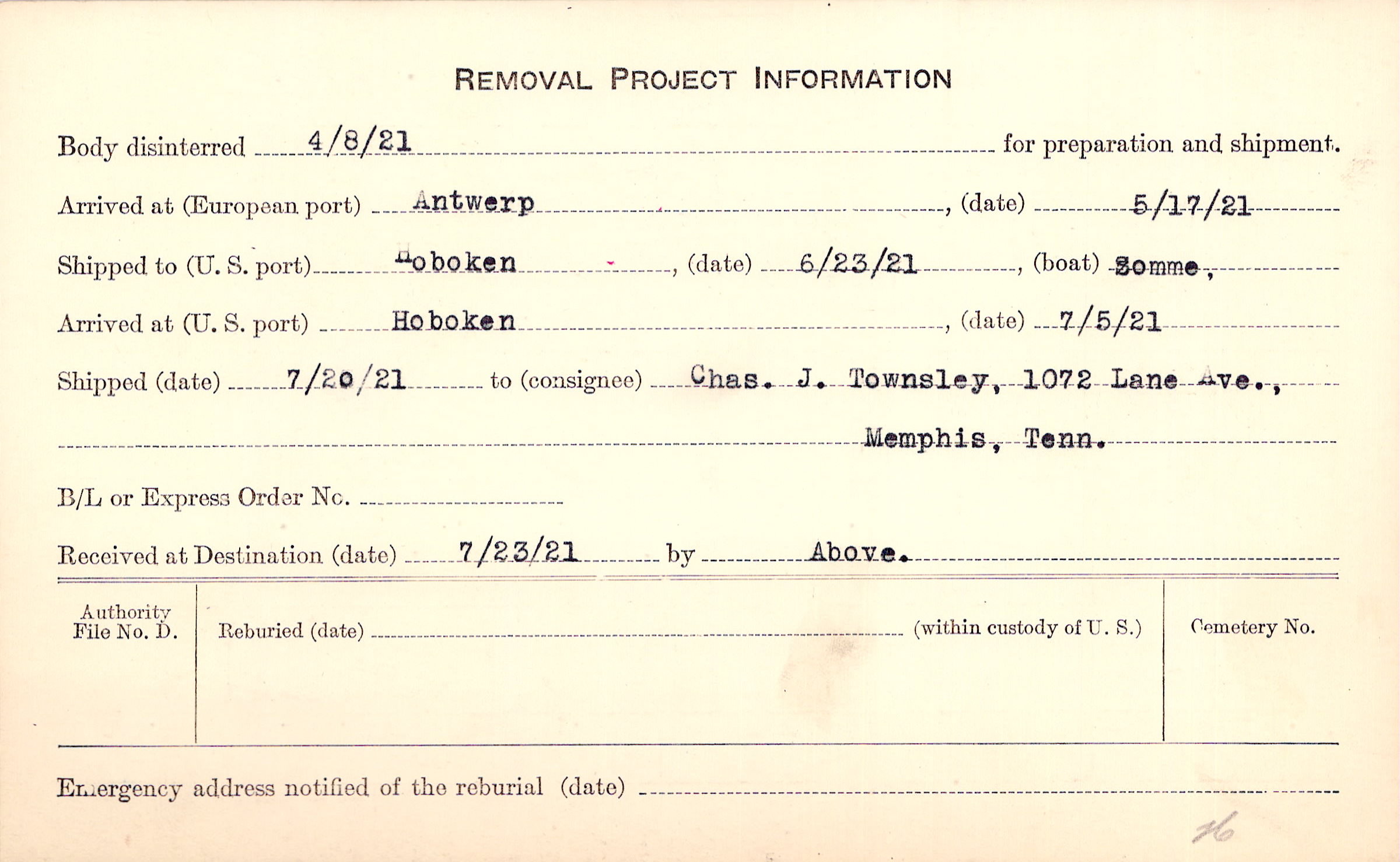 Body disinterred 4/8/1921 for preparation and shipment.