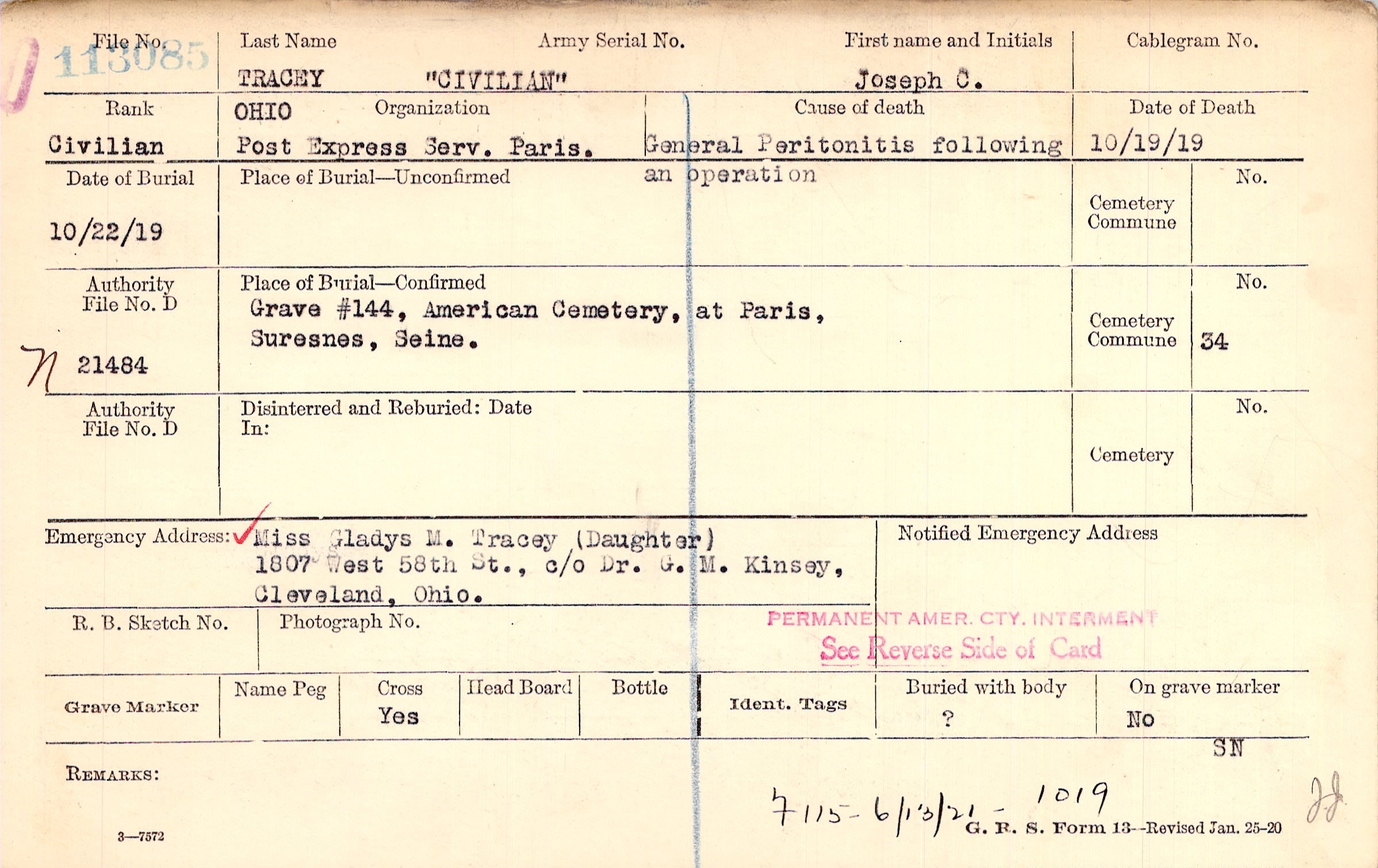 Miss Gladys M. Tracey (Daughter), 1807 West 58th St., c/o Dr. G. M. Kinsey, Cleveland, Ohio.