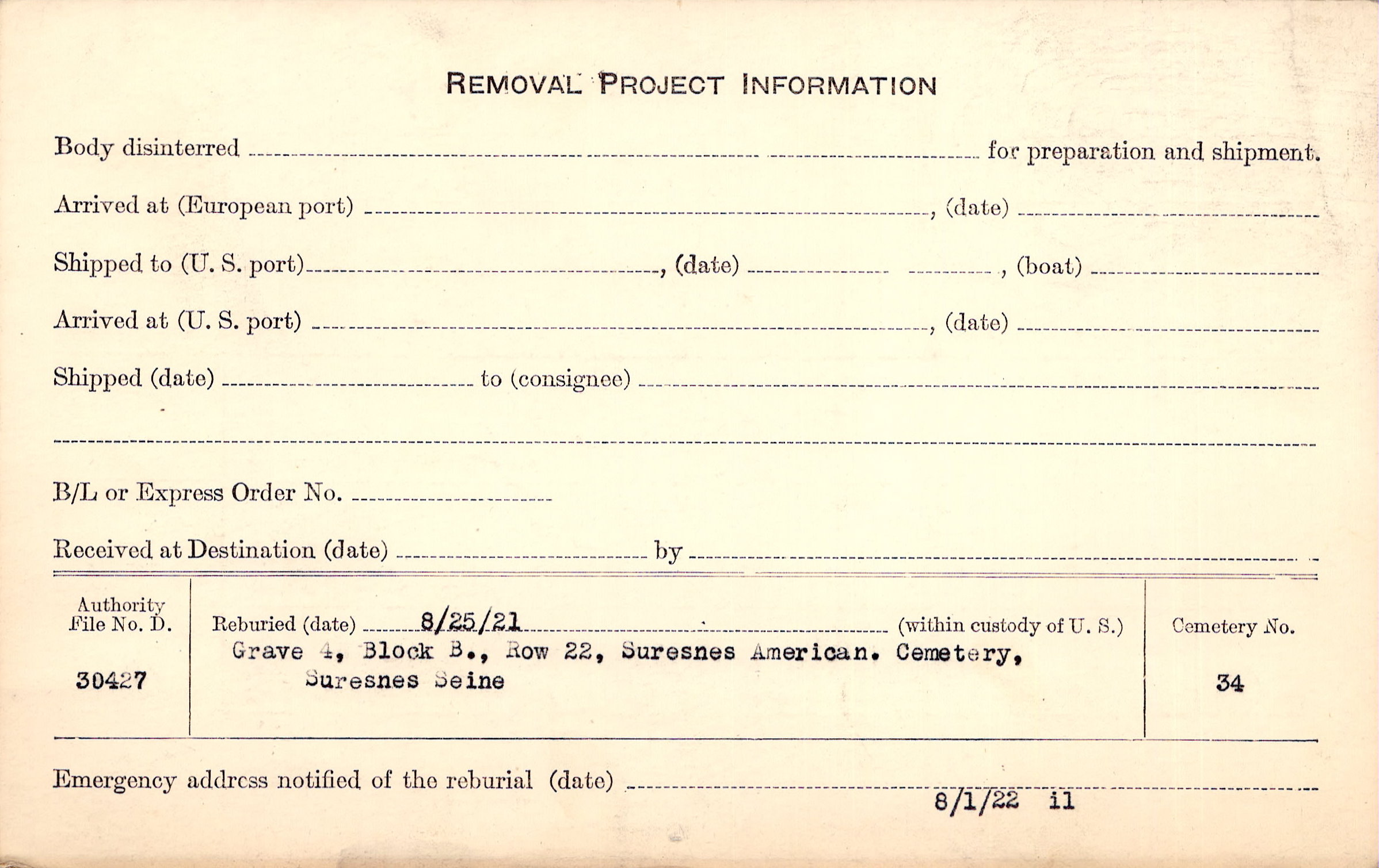 | Permanent Burial in Foreign Cemetery |