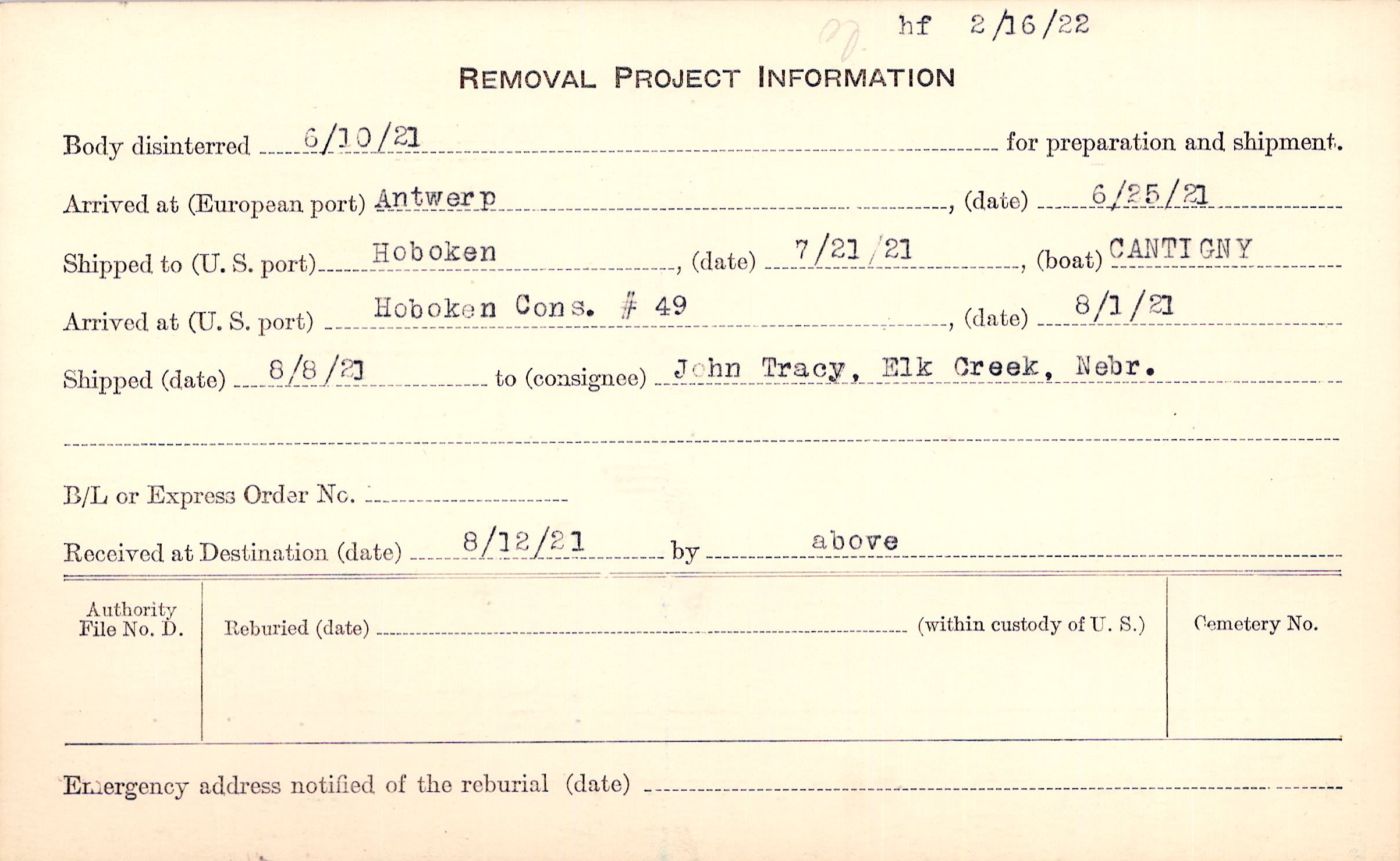 Body disinterred 6/10/1921 for preparation and shipment.