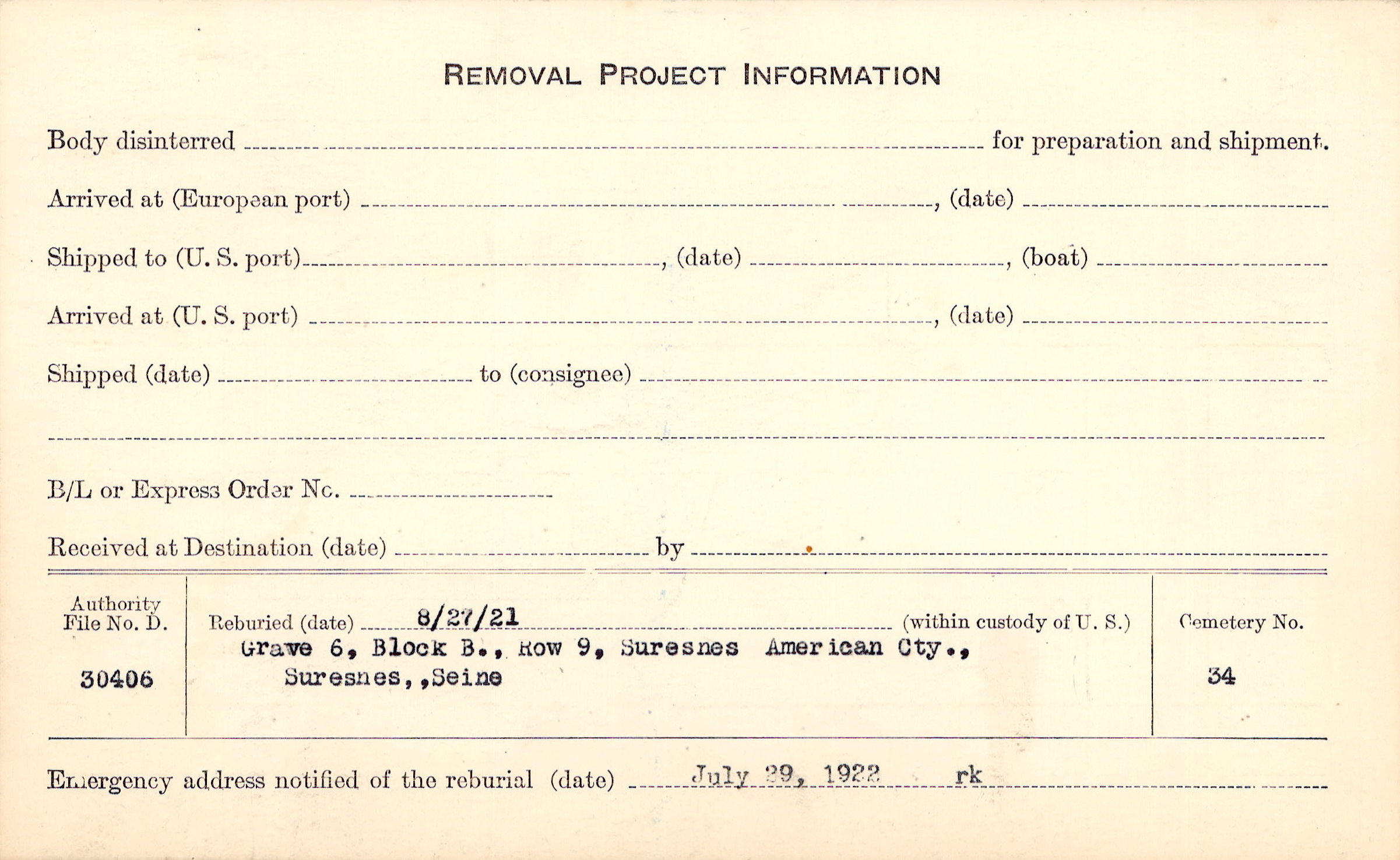 | Permanent Burial in Foreign Cemetery |
