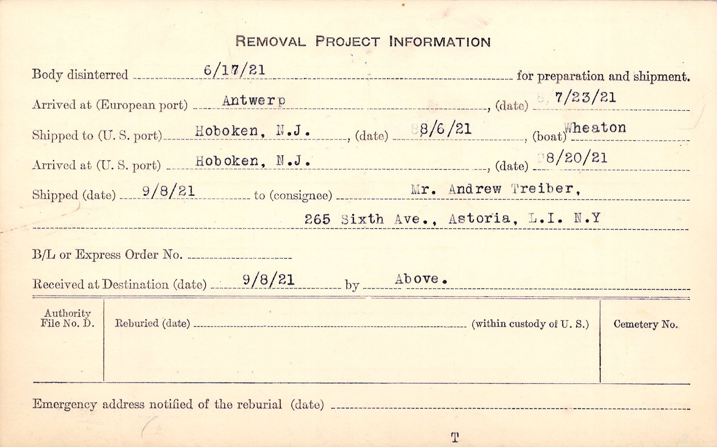 Body disinterred 6/17/1921 for preparation and shipment.