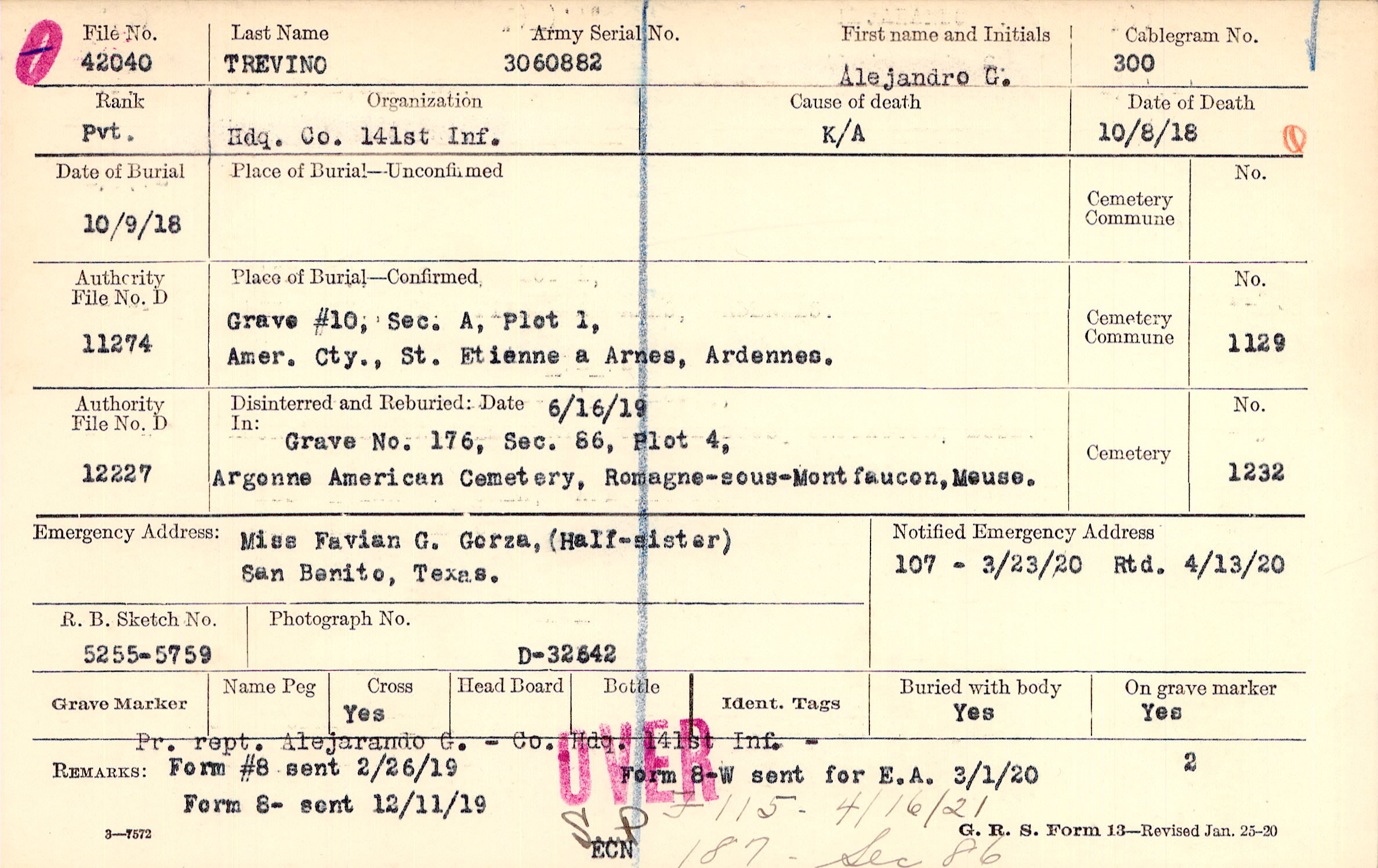 Pr. rept. Alejarando G. - Co. Hdq. 141st Inf. -, Form #8 sent 2/26/19 Form 8 - sent 12/11/19