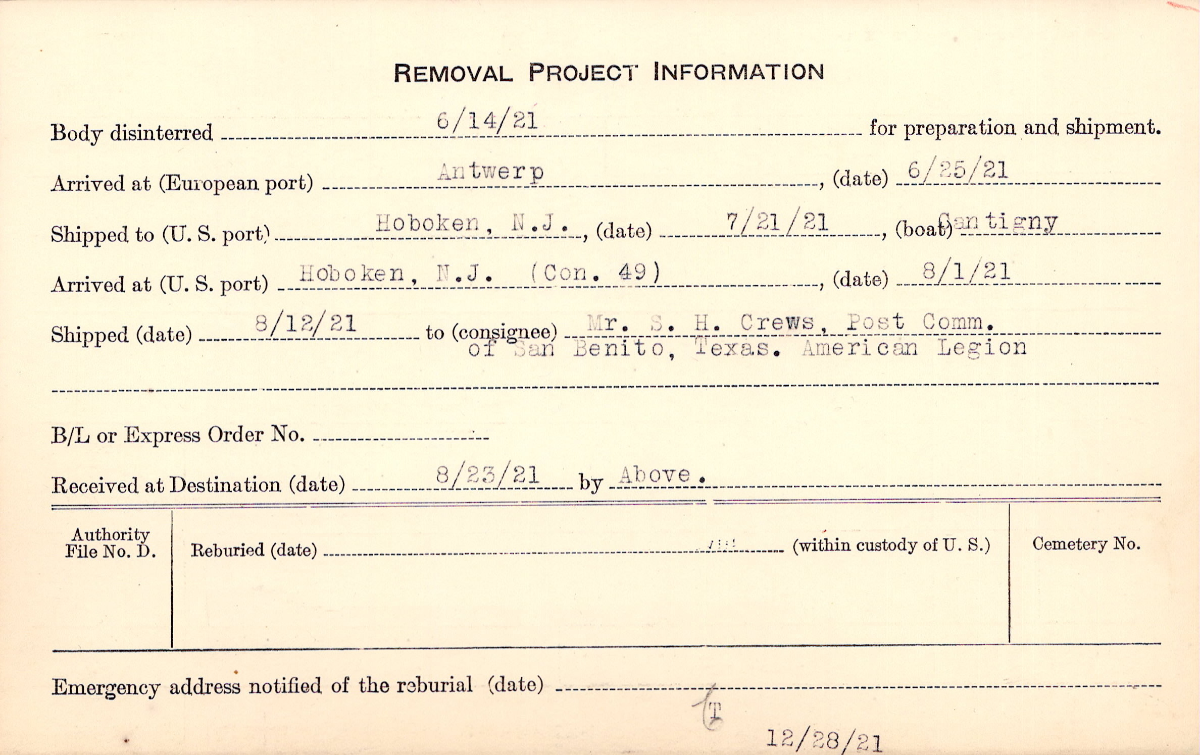 Body disinterred 6/14/1921 for preparation and shipment.