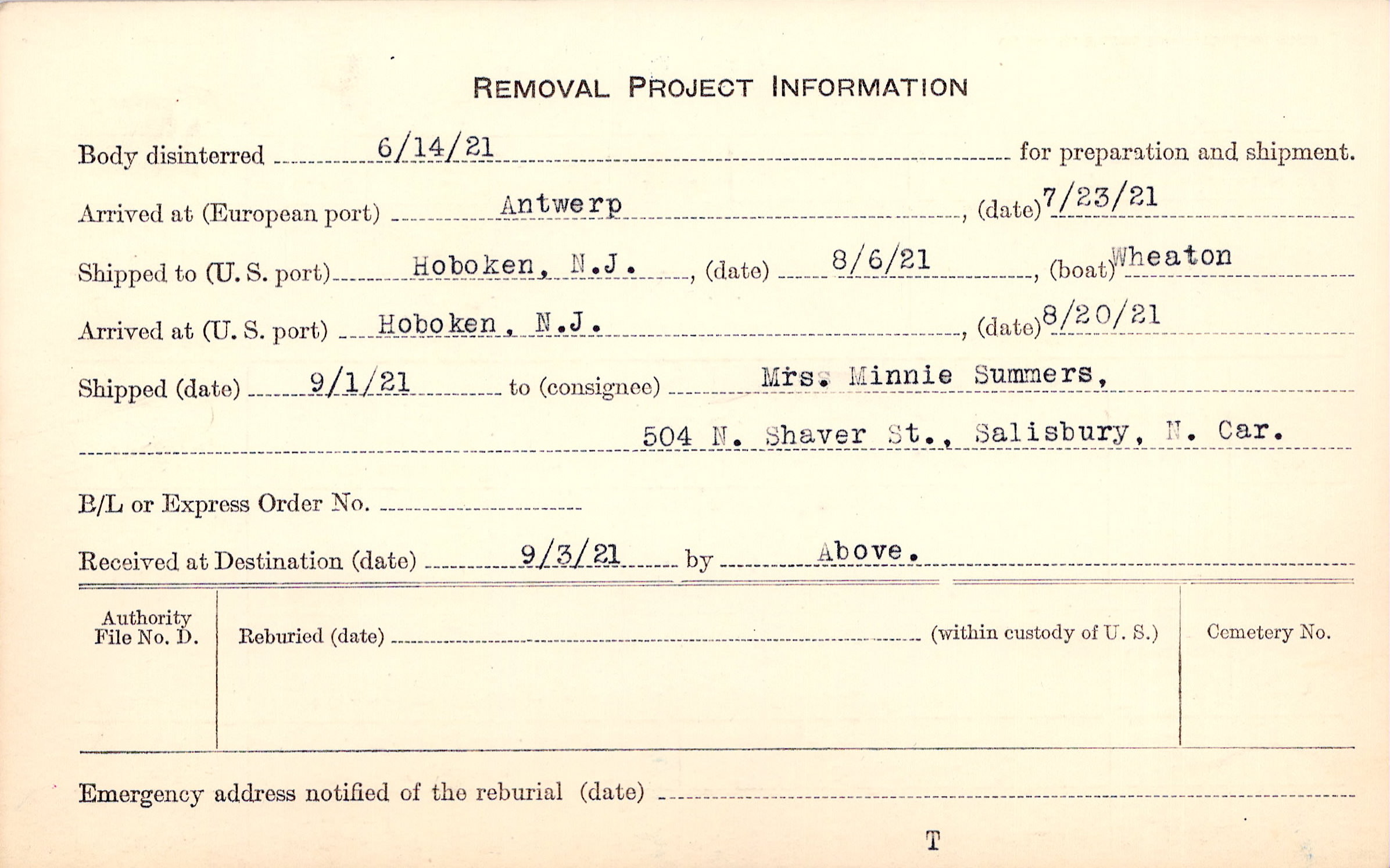 Mrs. Minnie Summers, (Mother), 504 N. Shaver St., Sailsbury, N.C.