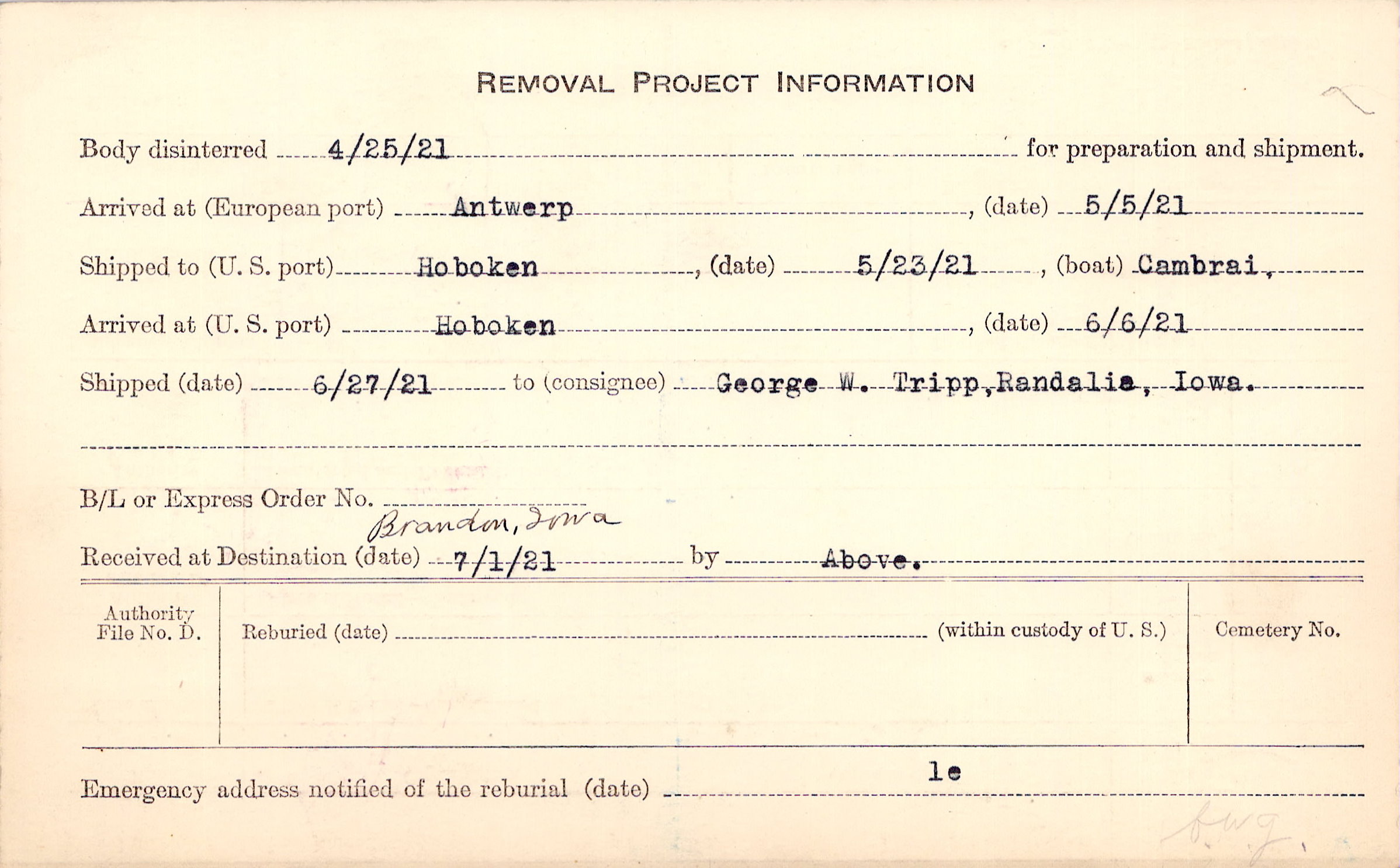 Body disinterred 4/25/1921 for preparation and shipment.