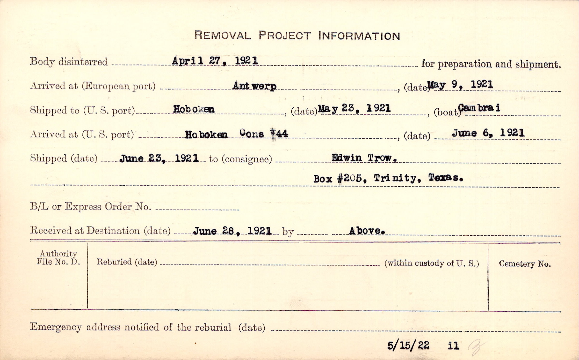 Edwin Trow (Father), P.O. Box #205, Trinity, Texas.
