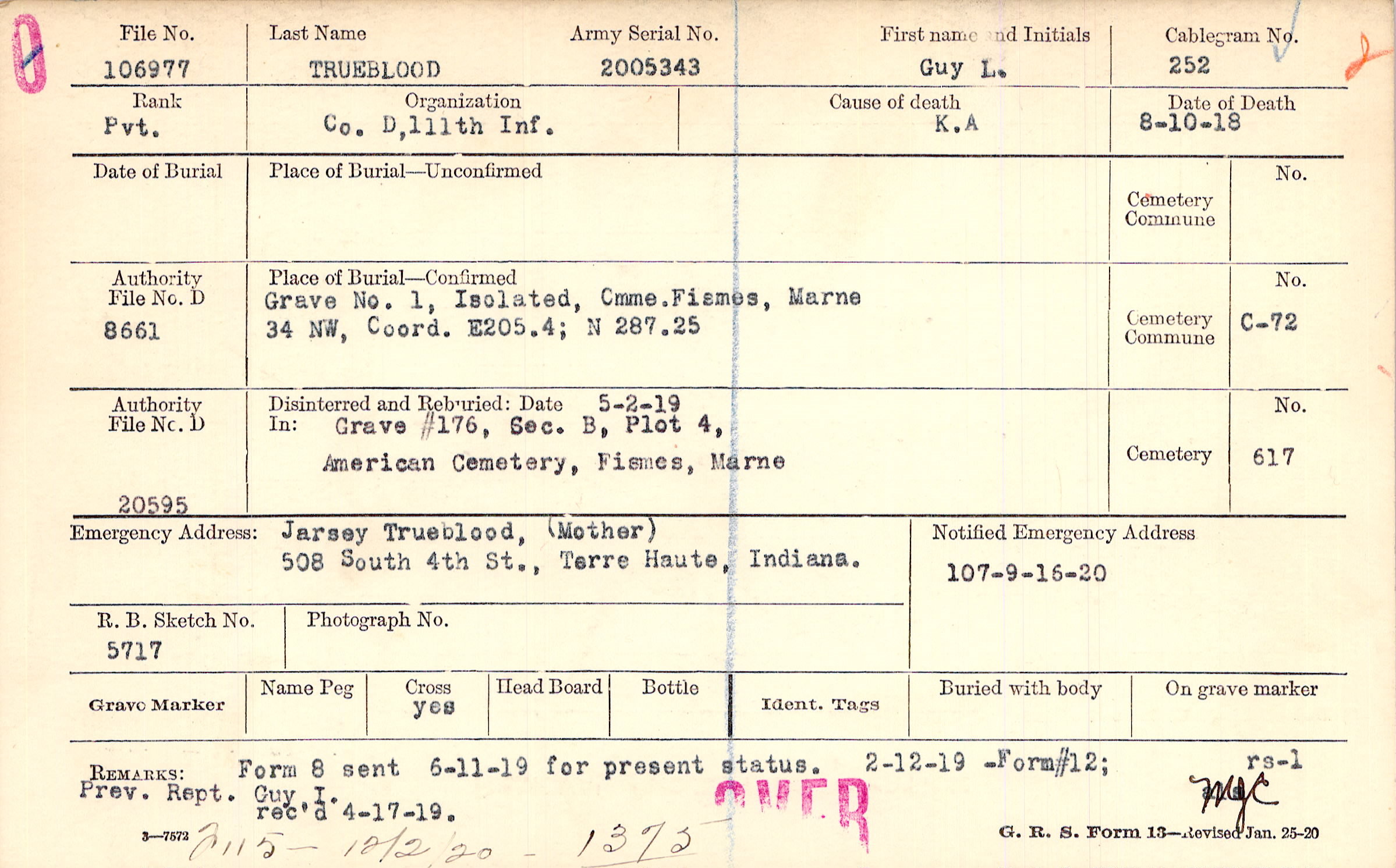 Jarsey Trueblood, (Mother), 508 South 4th St., Terre Haute, Indiana.