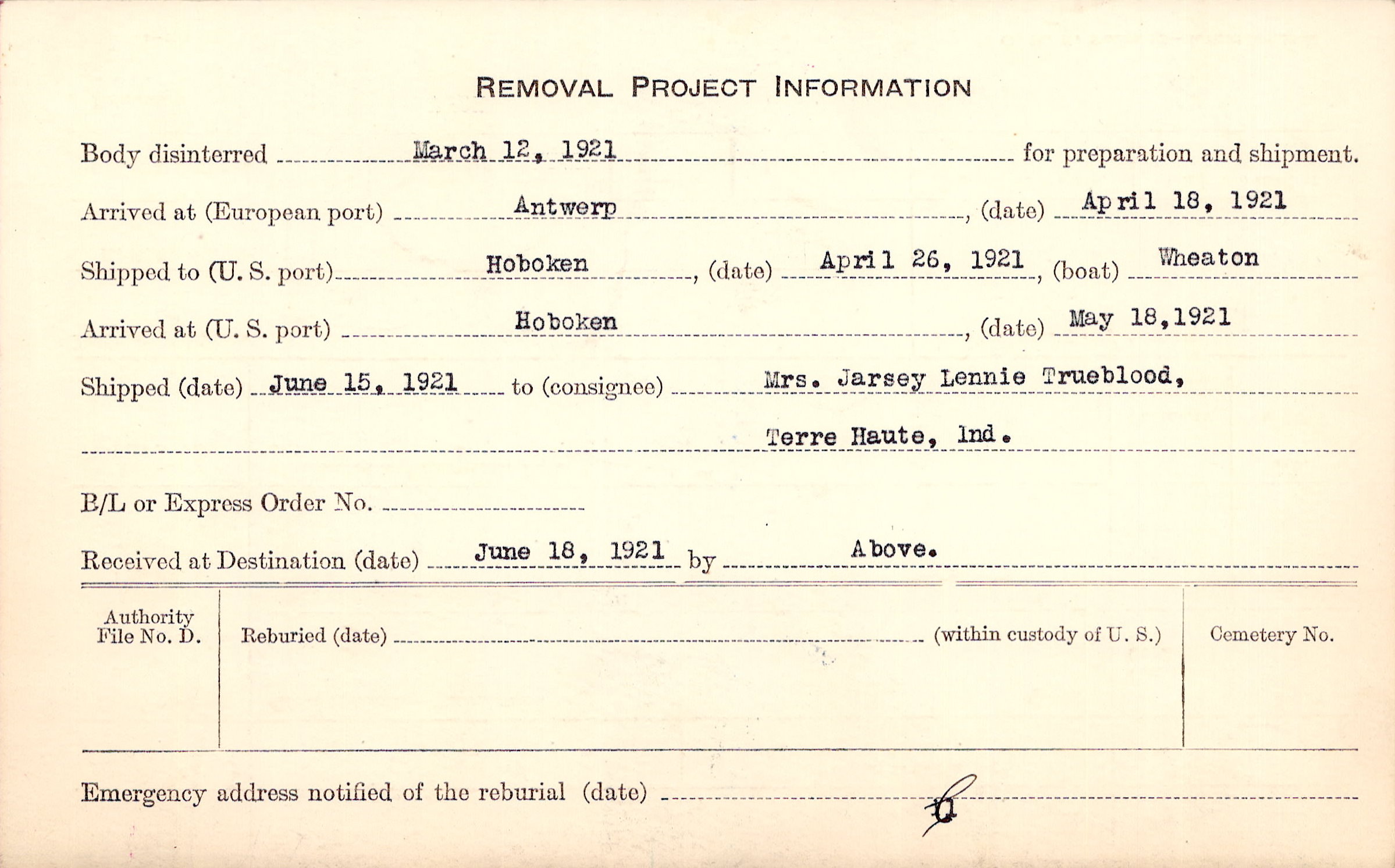 Body disinterred 3/12/1921 for preparation and shipment.