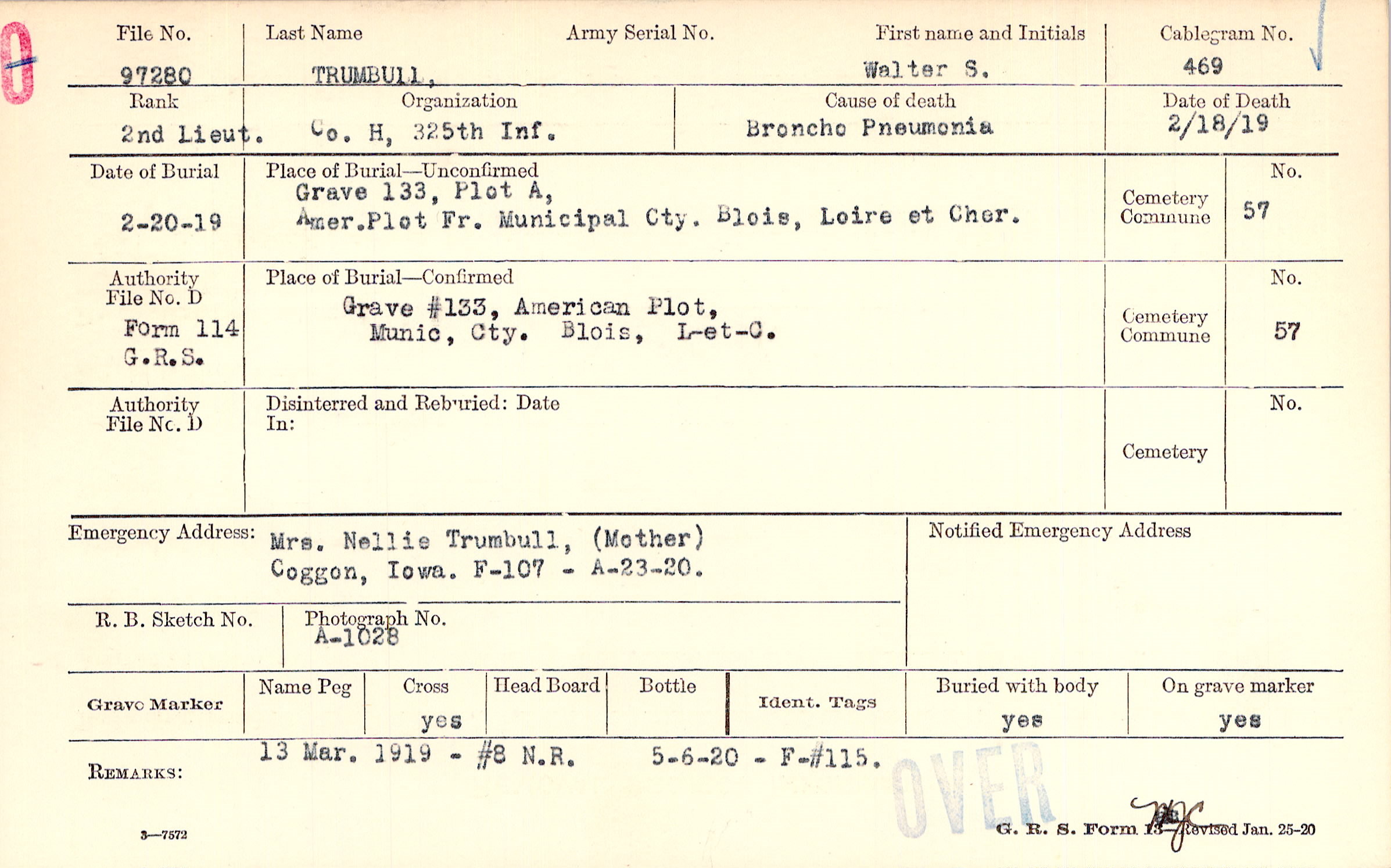 Grave 133, Plot A, Amer. Plot, Fr. Municipal Cty., Blois, Loire et Cher.