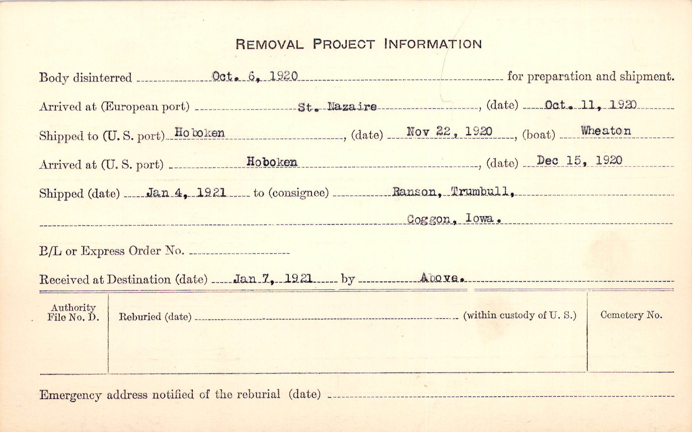 Body disinterred 10/6/1920 for preparation and shipment.