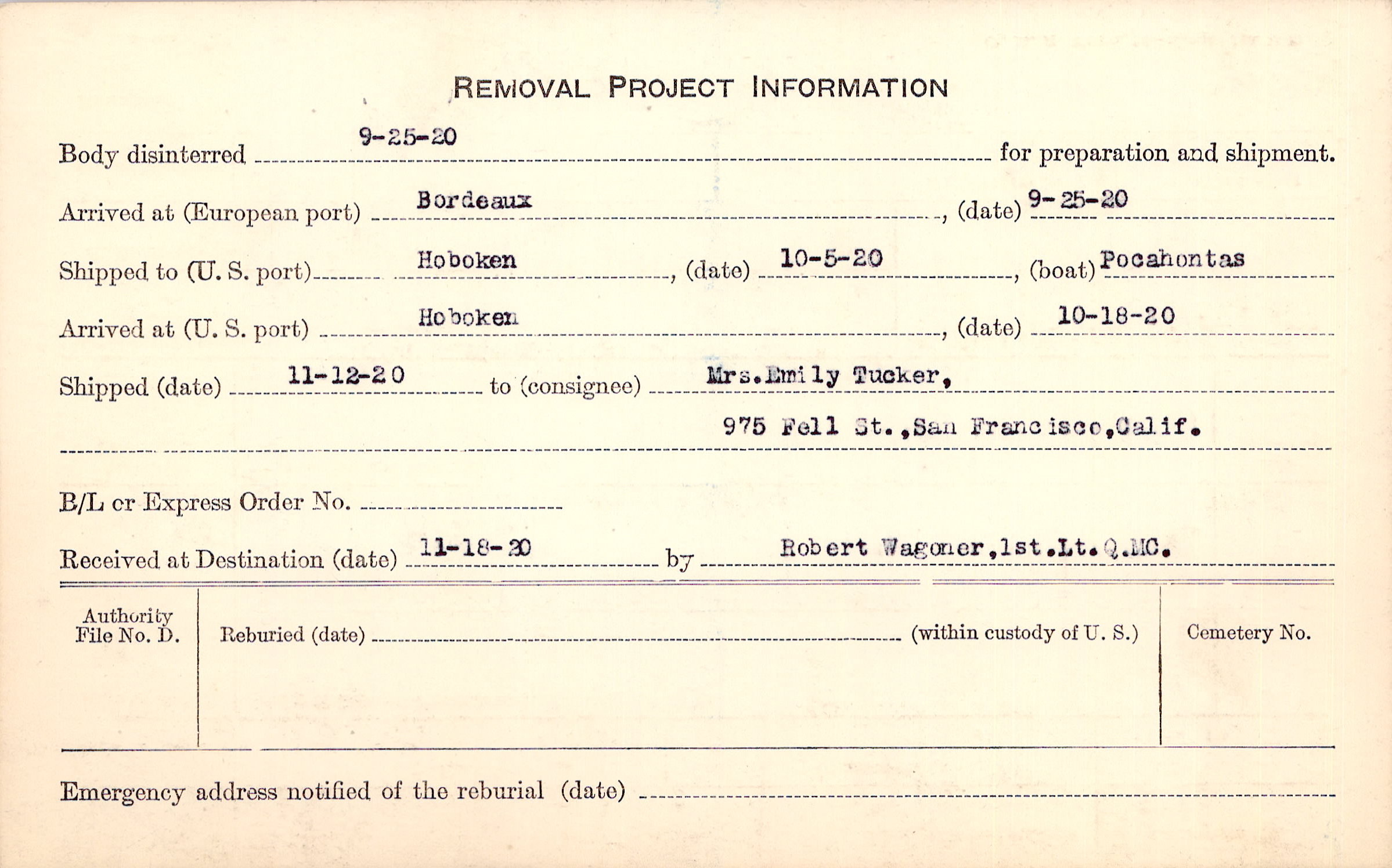 Body disinterred 9/25/1920 for preparation and shipment.