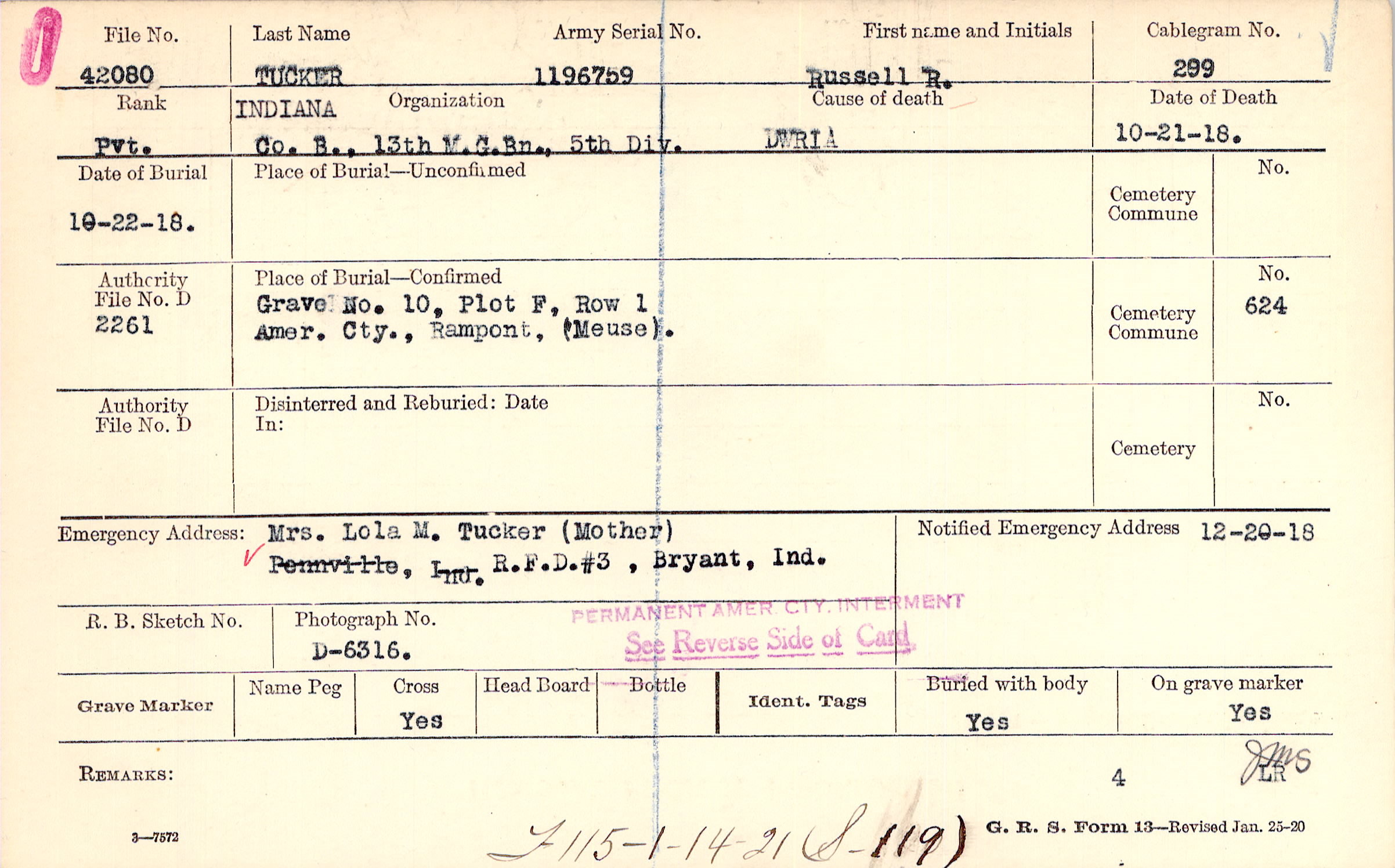 Mrs. Lola M. Tucker (Mother), R.F.D.#3, Bryant, Ind.