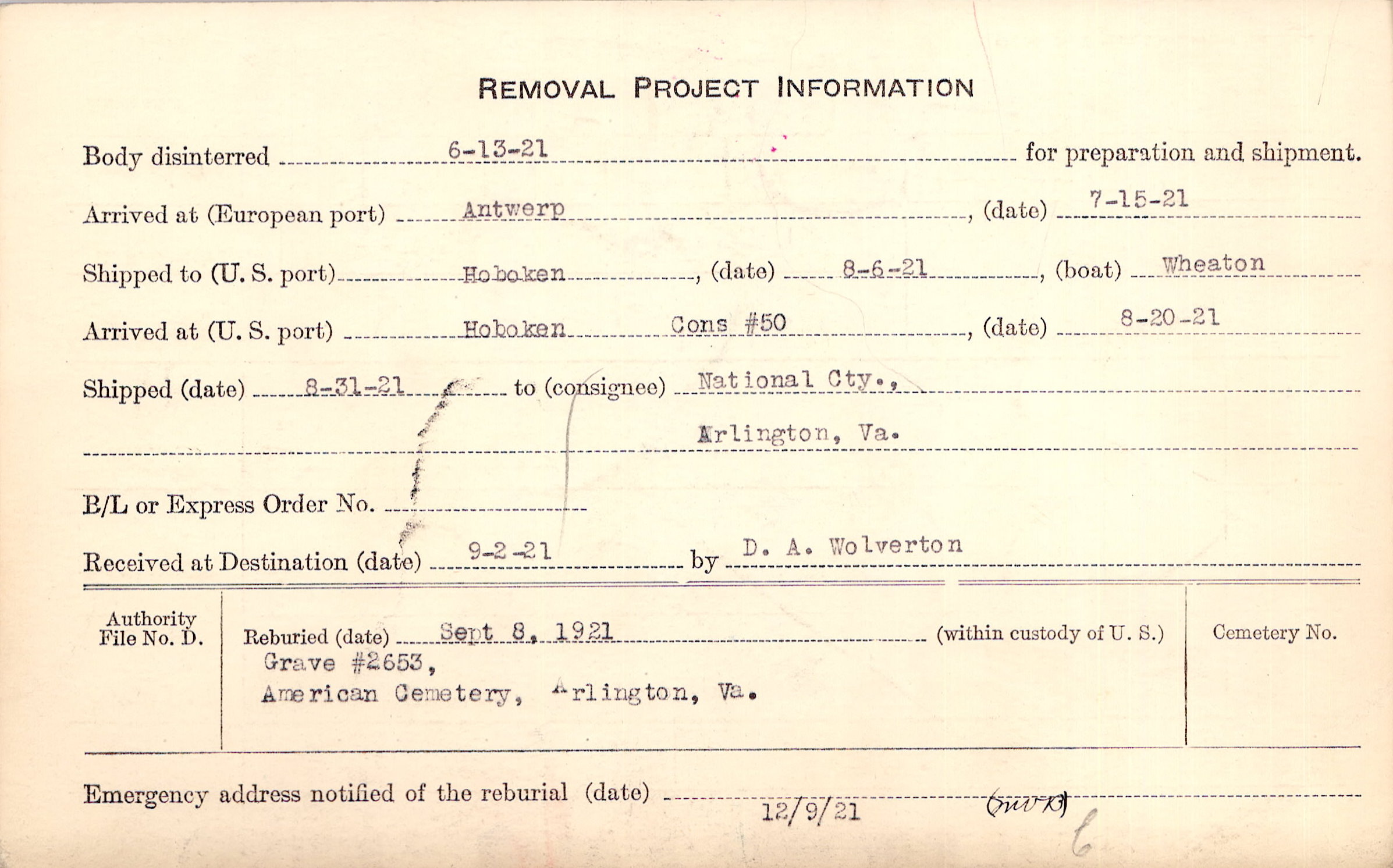 Body disinterred 6/13/1921 for preparation and shipment.