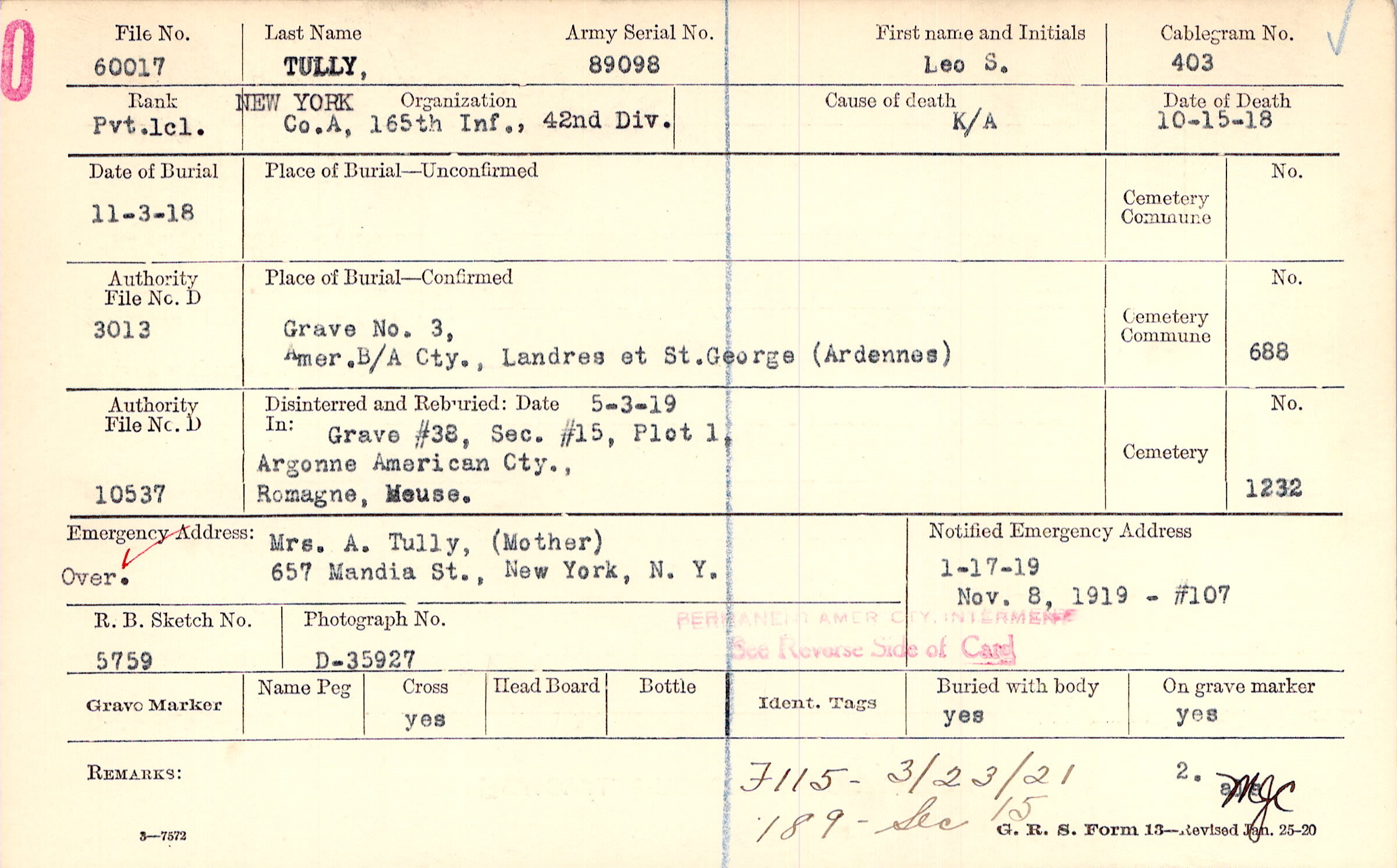Mrs. A. Tully, (Mother), 657 Mandia St. , New York, N.Y., Over.
