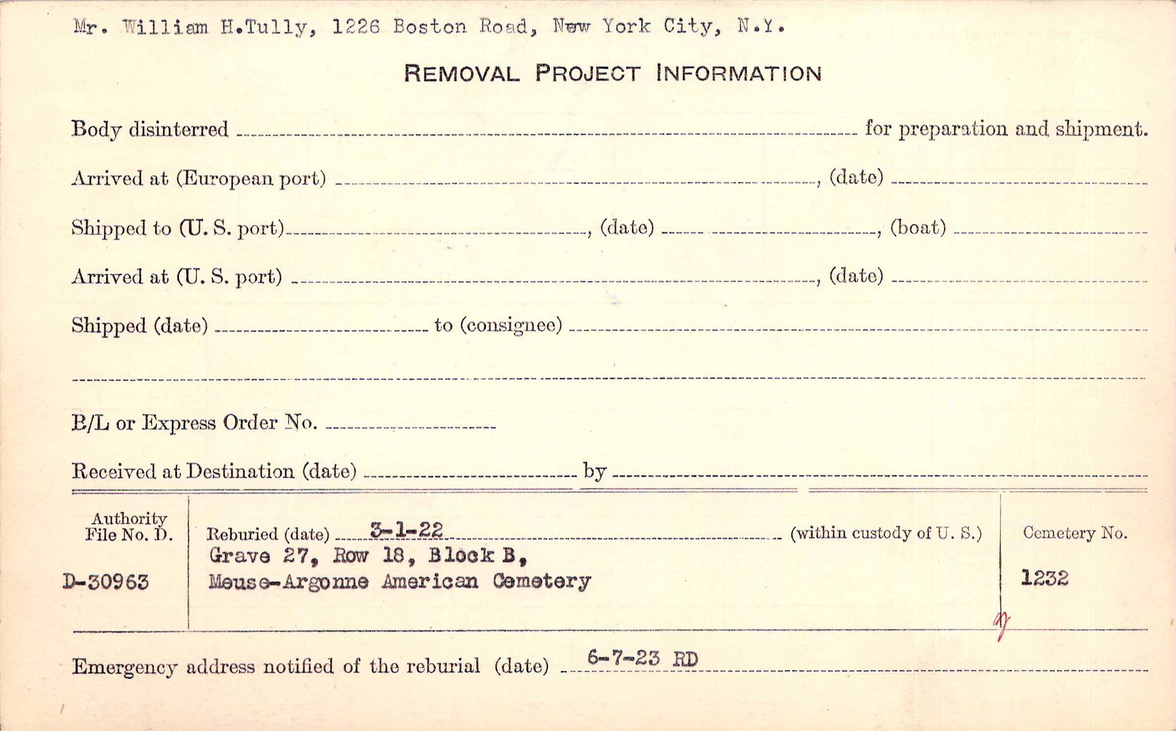 Mr. William H. Tully, 1226 Boston Road, New York City, N.Y. |
