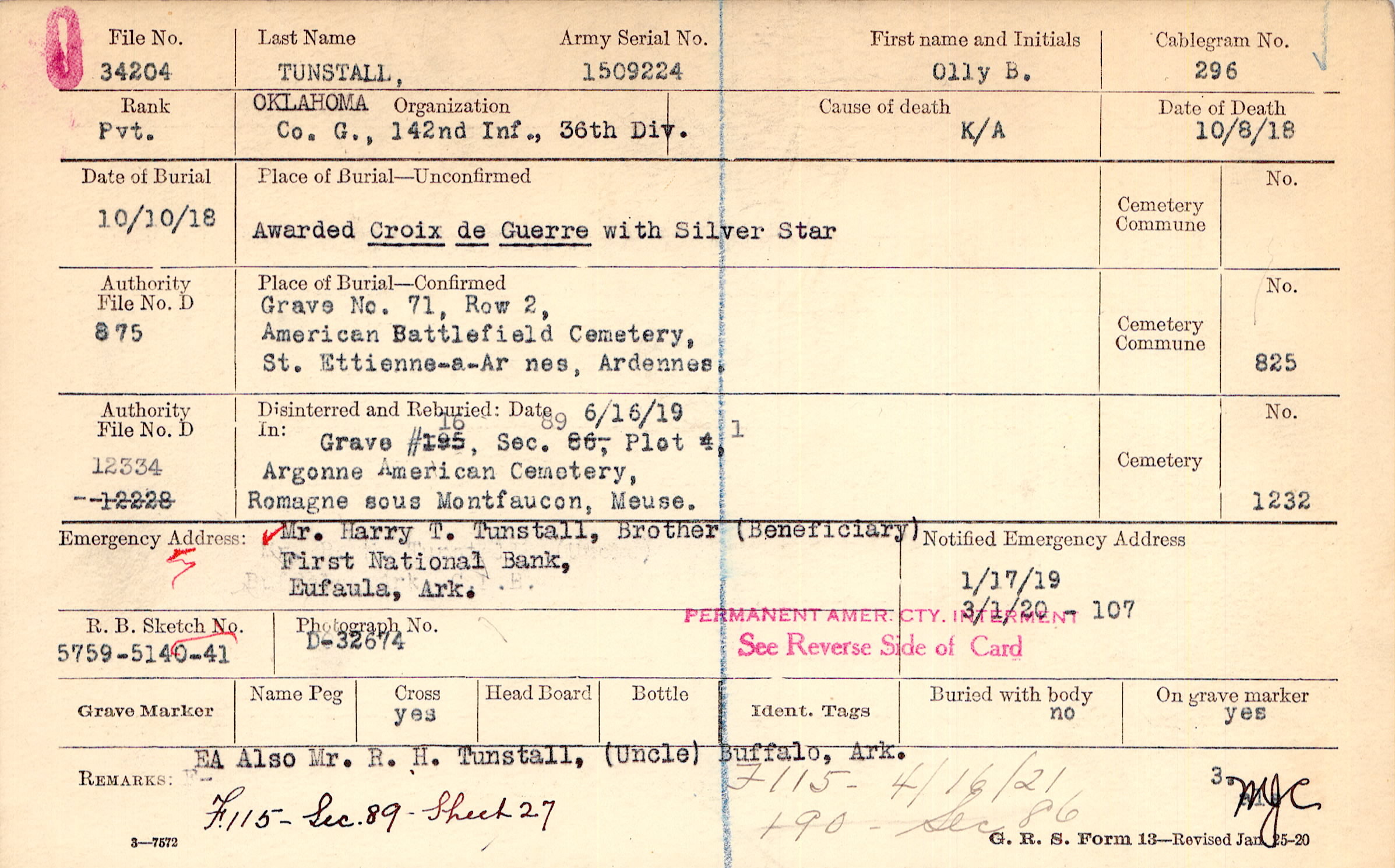 Mr. Harry T. Tunstall, Brother, First National Bank, Eufaula, Ark., (Beneficiary)