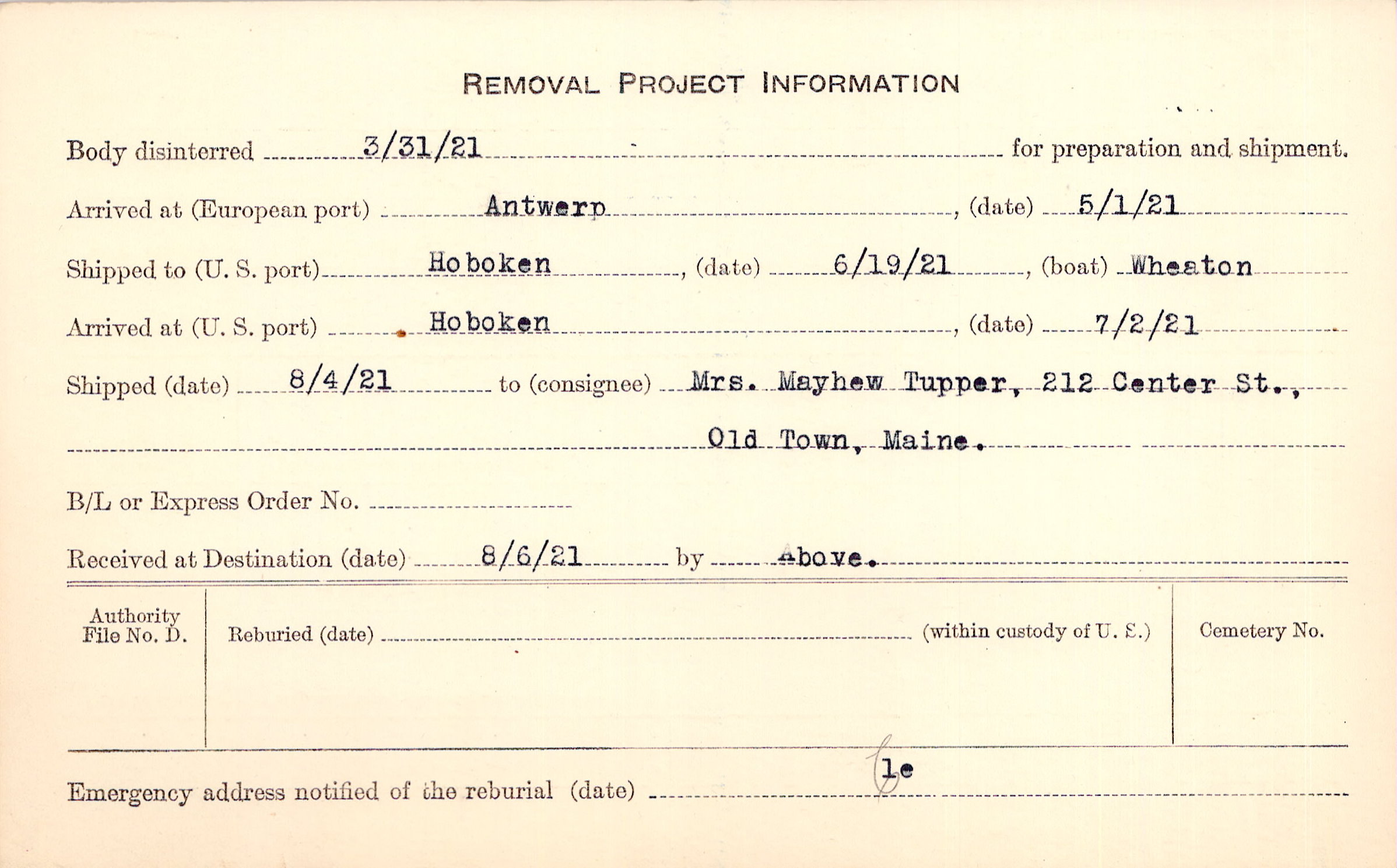 Mrs. Della Tupper, (Mother), 26 Front St., Old Town, Maine.