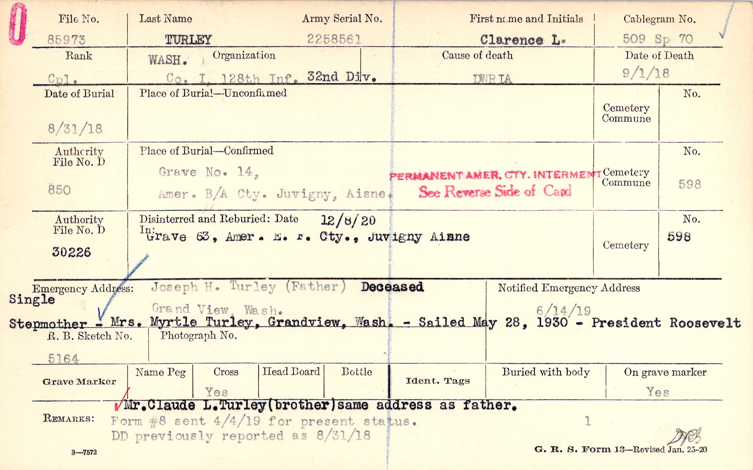 Mr. Claude L. Turley (brother) same address as father. DD previously reported as 8/31/18, Form #8 sent 4/4/19 for present status.
