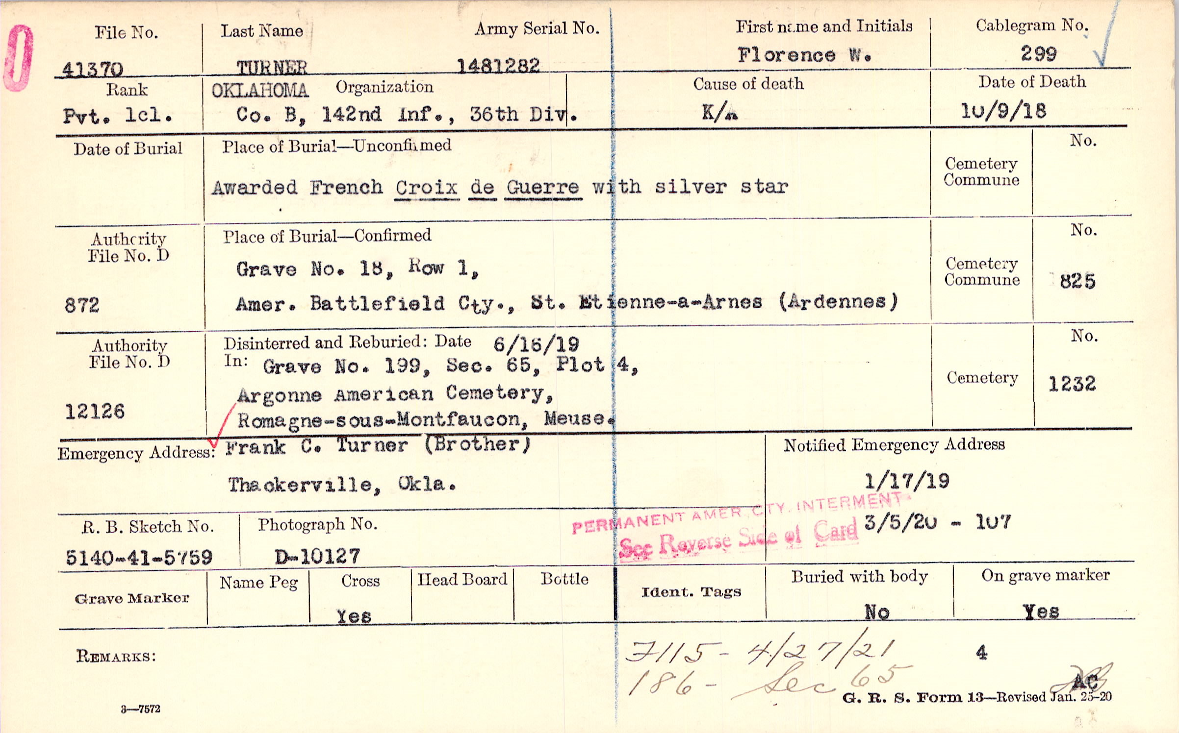 Grave 199, Section 65, Plot 4, Argonne American Cemetery, Romagne-sous-Montfaucon, Meuse