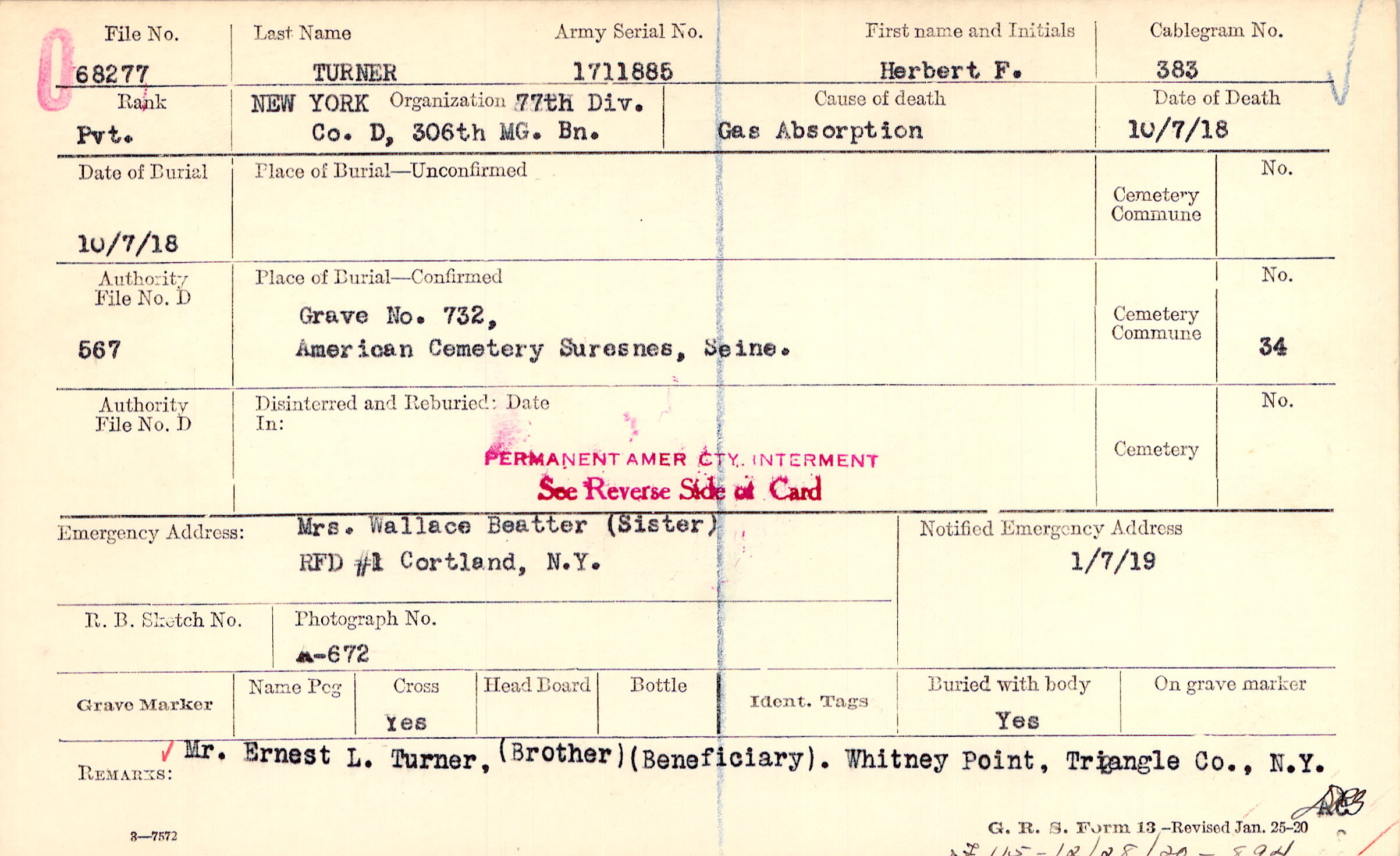 Mrs. Wallace Beatter (Sister), RFD #1 Cortland, N.Y., Mr. Ernest L. Turner, (Brother) (Beneficiary) Whitney Point, Triangle Co., N.Y.