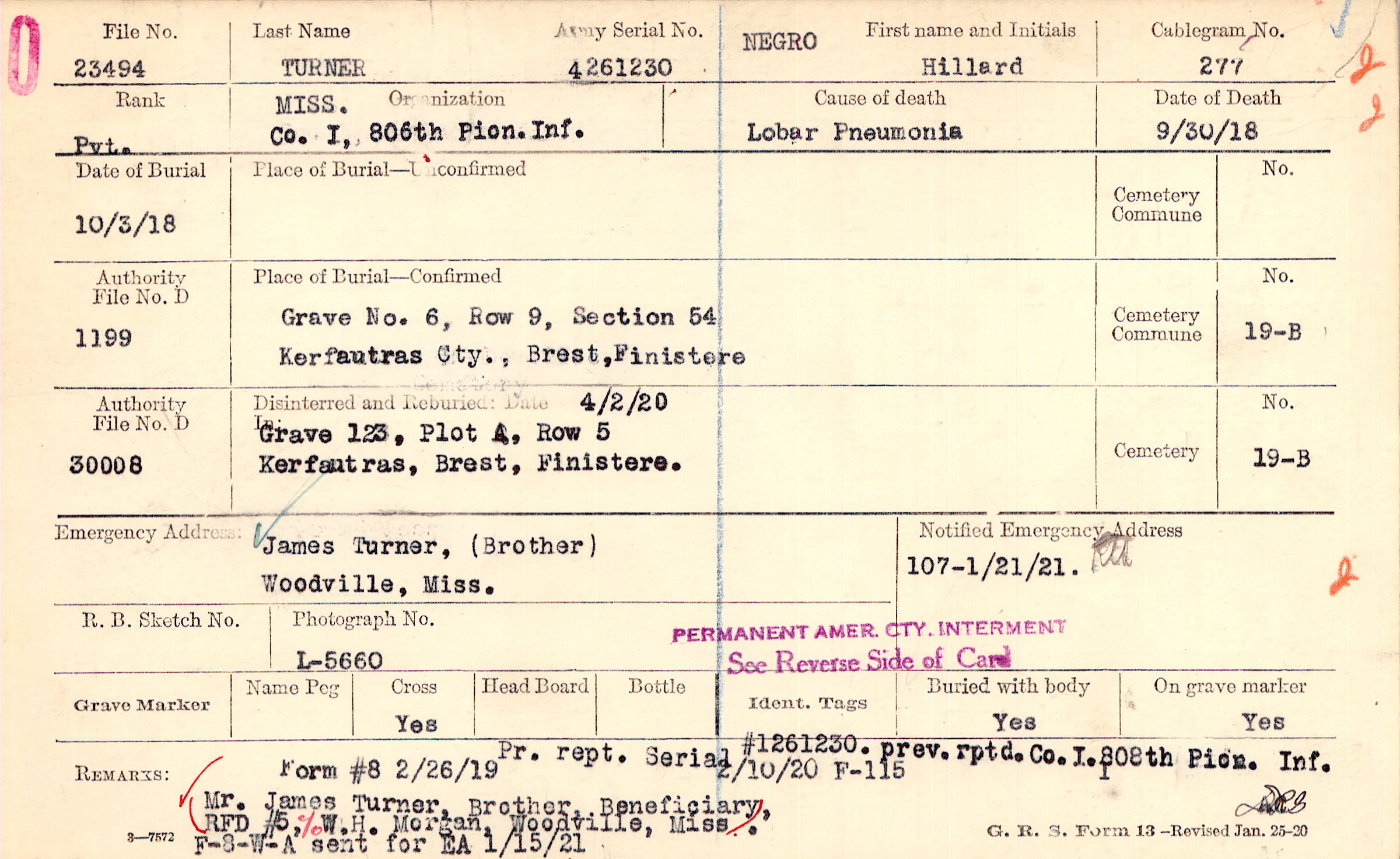 Pr. rept. Serial #1261230. prev. rptd. Co. I. 808th Pion. Inf. Mr. James Turner, Brother, Beneficiary, RFD #5, c/o W.H. Morgan, Woodville, Miss., Form #8 2/26/19