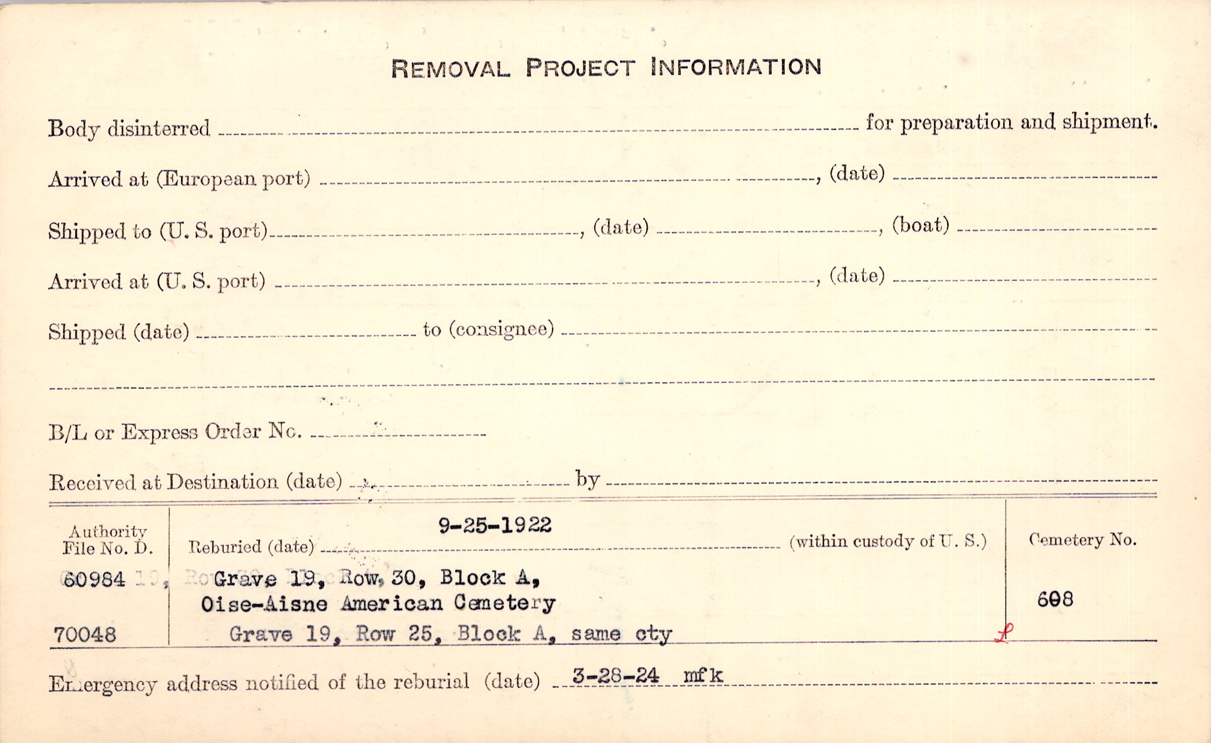 Prior Burial in Foreign Cemetery |