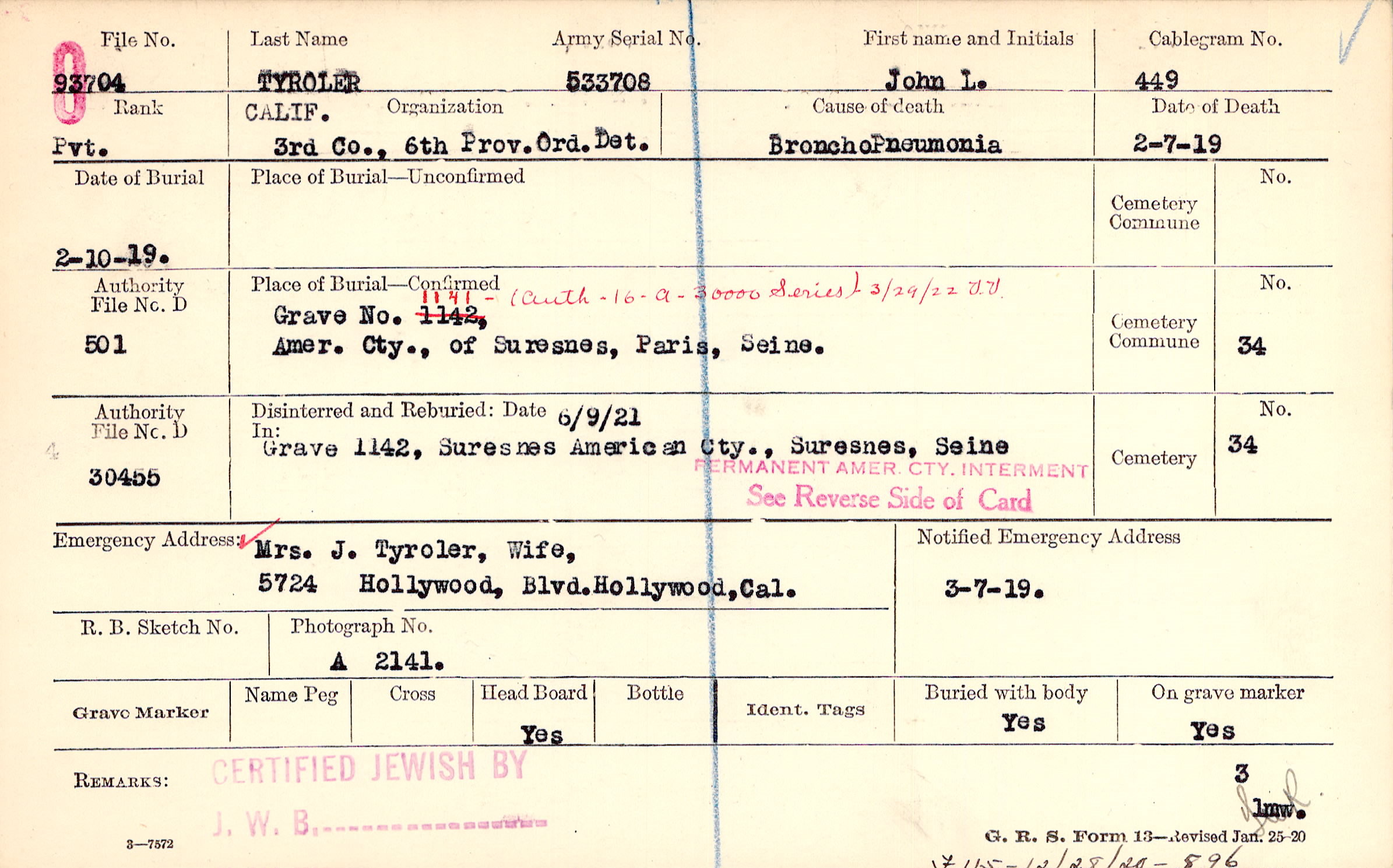 Mrs. J. Tyroler, Wife,, 5724 Hollywood, Blvd. Hollywood, Cal.