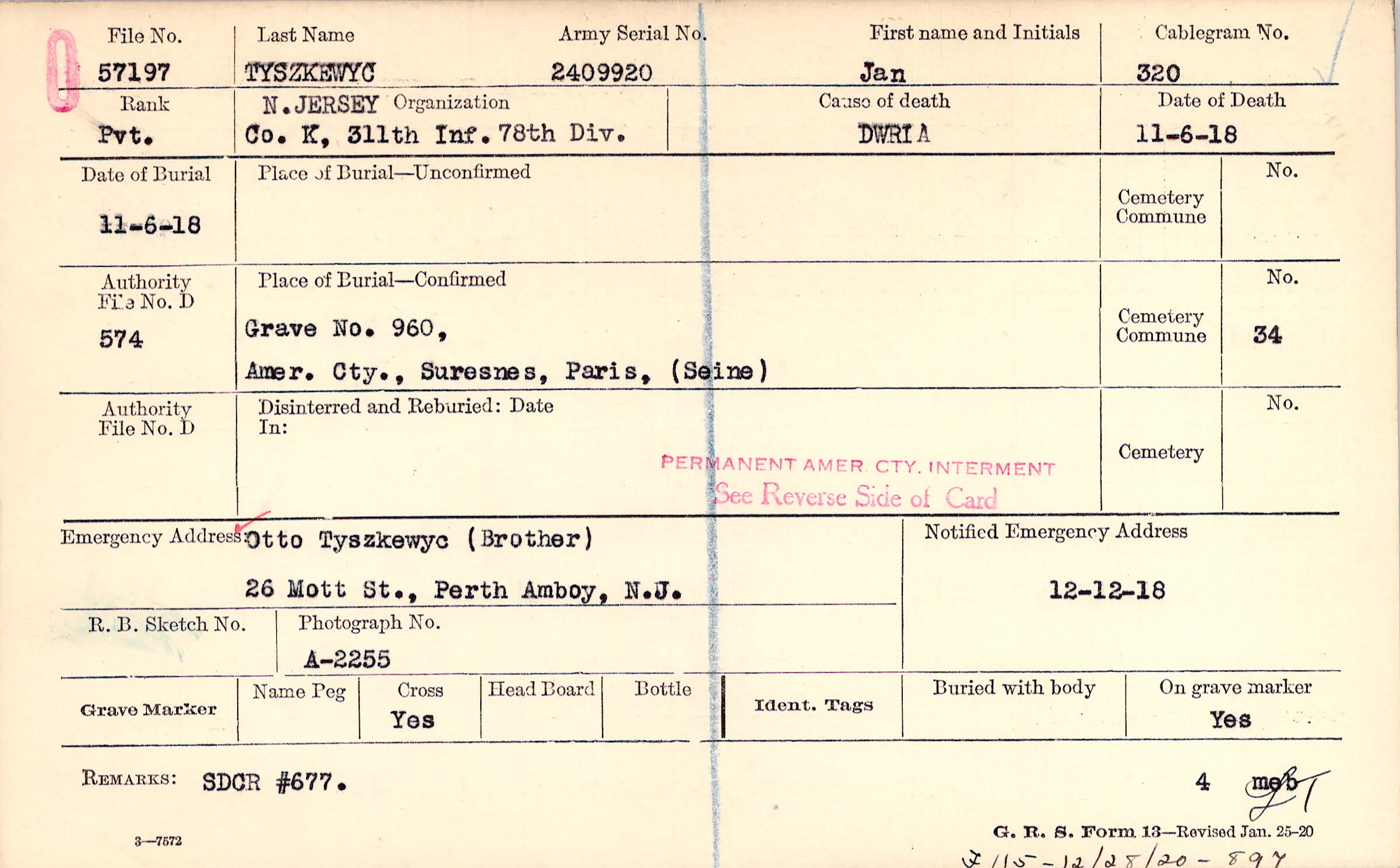 Otto Tyszkewyc (Brother), 26 Mott St., Perth Amboy, N.J.